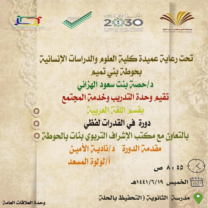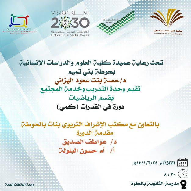 تُواصل وحدة التدريب وخدمة المجتمع بكلية العلوم والدراسات الإنسانية بحوطة بني تميم تنفيذ مبادرة منوعة لدورات تدريبية لاختبار القدرات ( لفظي – وكمي ) لطالبات المدارس الثانوية، تحت قيادة عميدة الكلية د. حصة بنت سعود الهزاني، وذلك لرفع نسبة الاستعداد النفسي والمعرفي لدى الطالبات المتقدمات لاختبارات القدرات العامة. حيث أقامت وحدة التدريب وخدمة المجتمع بقسم اللغة العربية دورة تدريبية عن اختبار القدرات اللفظي بمدرسة متوسطة و ثانوية التحفيظ بالحلة. قدمتها د. نادية الأمين و أ. لولوة المسعد، وذلك في يوم الخميس الموافق 1441/6/19هـ. وقد تم تعريف الطالبات بأهمية اختبار القدرات ودوره في المفاضلة عند القبول . وتم تعريف الاختبار ونوع الأسئلة التي يشتمل عليها الاختبار مثل الكلمة الشاذة وإكمال الجمل واستيعاب المقروء. وتم التدريب على كل نوع منها . وقد وجدت الدورة قبولاً استحساناً من الطالبات وطالبن بالمزيد من الدورات. كما تتابعت الدورات بتنظيم وحدة التدريب وخدمة المجتمع بقسم الرياضيات دورة القدرات القسم (الكمي). في يوم الثلاثاء الموافق: 1441/6/23هـ بالمدرسة الثانوية بالحلوة، قدمتها .د. عواطف صديق و أ. أم حسون بلوله الأمين. وشهدت الدورة تفاعلاً من قبل الطالبات، حيث تم تعريفهن بكيفية الاستعداد لاختبار القدرات والأساليب الرياضية الضرورية التي تتبعها الطالبة مع عرض أمثلة لأسئلة الاختبار ومناقشتها معهن ، وتم توزيع ورقة عمل على الطالبات.