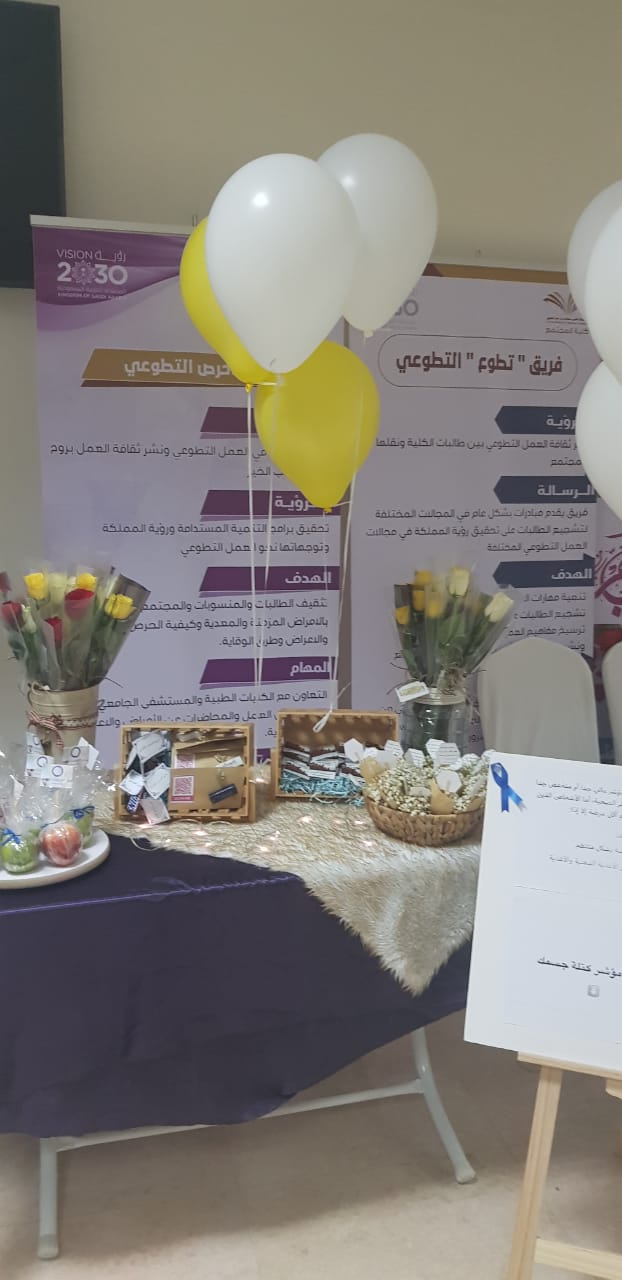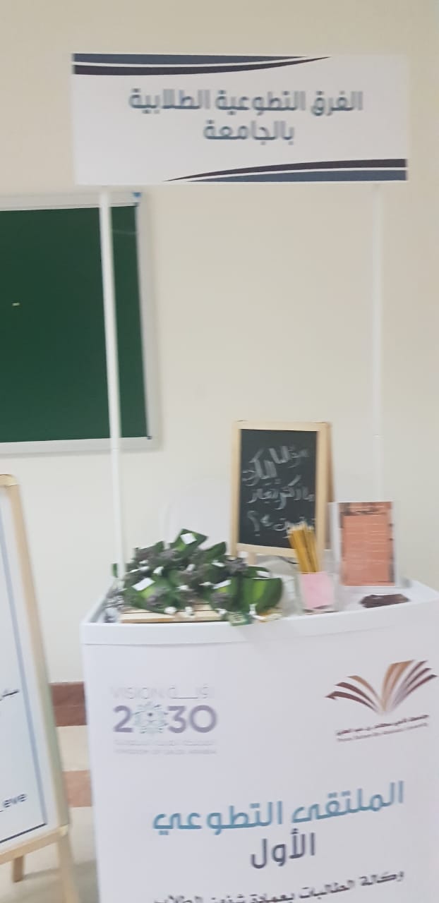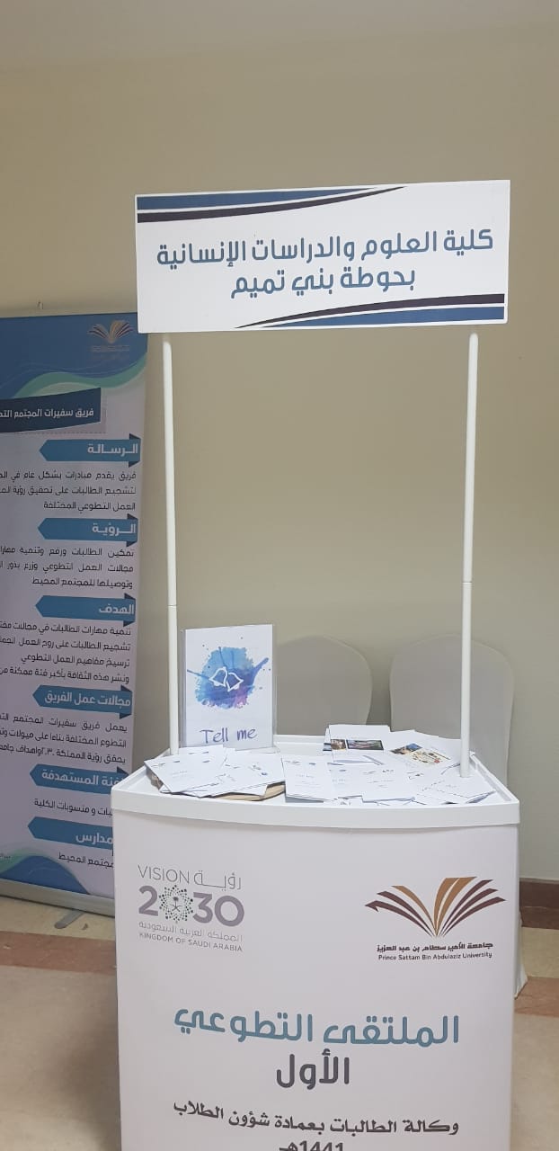 تسعى شعبة العمل التطوعي بوحدة النشاط الطلابي بكلية العلوم والدراسات الإنسانية بحوطة بني تميم، تحت قيادة عميدة الكلية الدكتورة/ حصه سعود الهزاني، إلى نشر ثقافة التطوع بين طالبات الكلية وبناء جيل فعال ومؤثر في المجتمع المحلي، يحمل على عاتقه مسؤولية تفعيل مبادرات العمل الطوعي، والمسؤولية المجتمعية في مختلف قطاعات المجتمع المحلي. حيث شاركت شبعة العمل التطوعي في الملتقى التطوعي الأول بمبادرةtell me من قسم نظم المعلومات، ويهدف إلى ربط المدرسة بأولياء امور الطلاب والتواصل المستمر. وأيضا شارك فريق عوان من قسم اللغة الانجليزية وهو فريق تطوعي يخدم طلاب وطالبات جامعة الأمير سطام بن عبد العزيز، وارشادهم نحو الجامعة والإجابة عن أسئلتهم. كما تم استعراض البرامج والمبادرات التطوعية التي تم تنفيذها, وحصلت الكلية على درع مبادرتي للأعمال التطوعية بقيادة الدكتورة أميرة صالح وذلك يوم الخميس الموافق: 1441/6/26هـ. بمناسبة تميز ونجاح المعرض والملتقى التطوعي الأول بعمادة شؤون الطلاب في كلية العلوم والدراسات الانسانية .