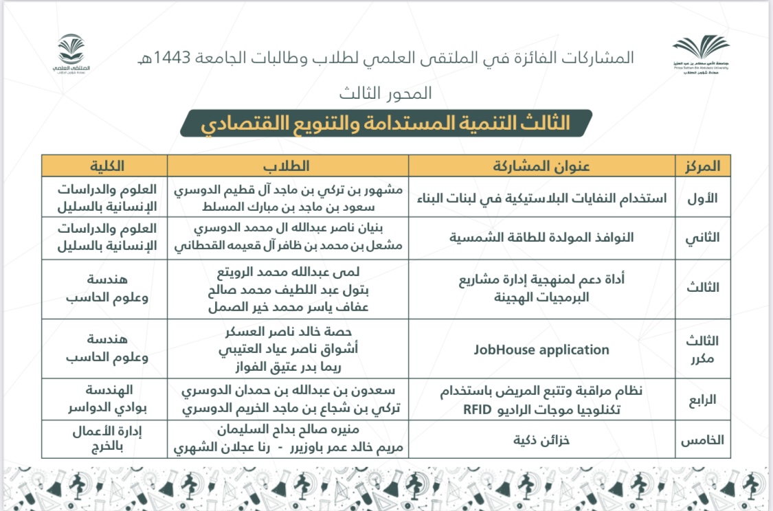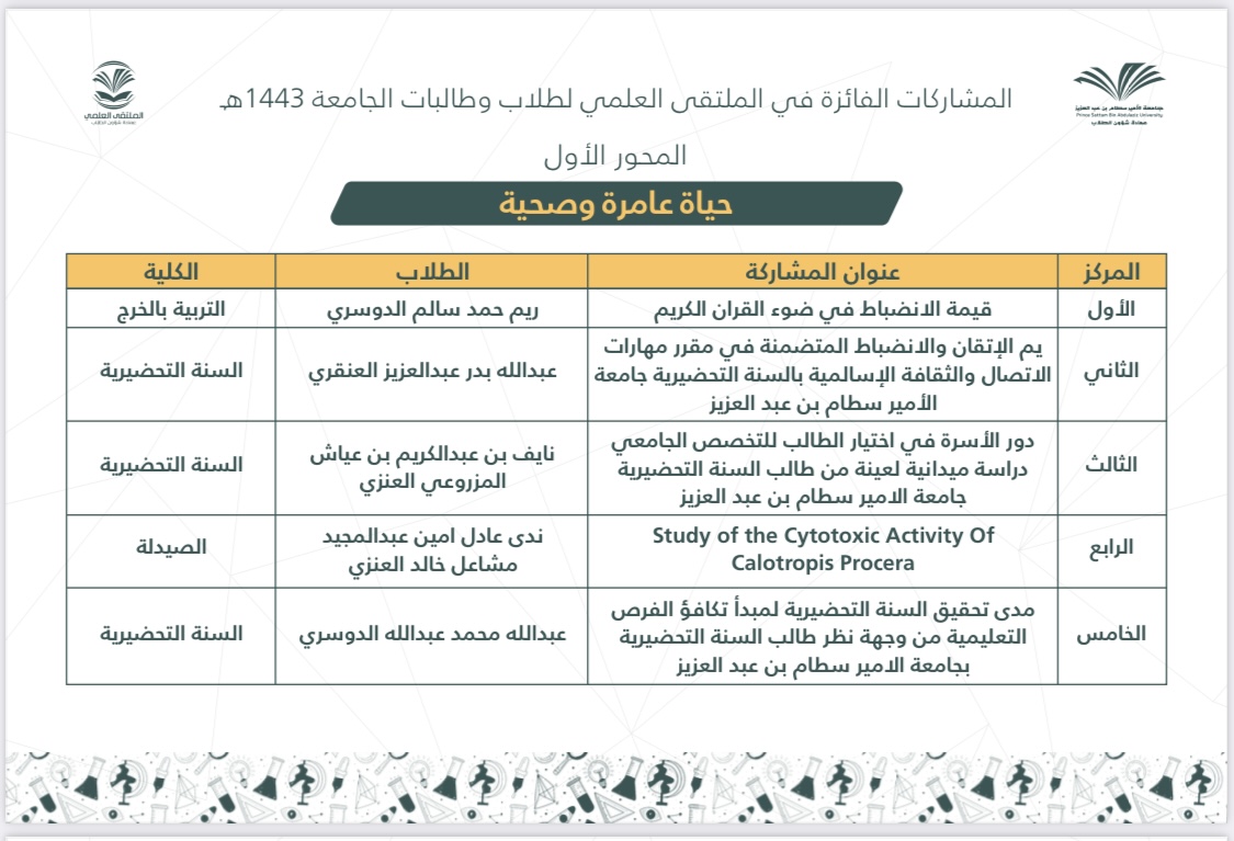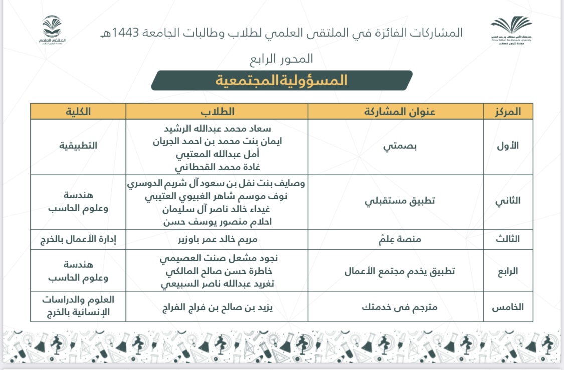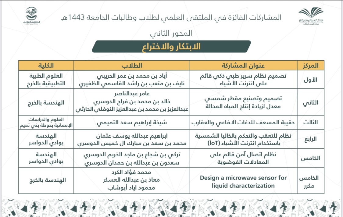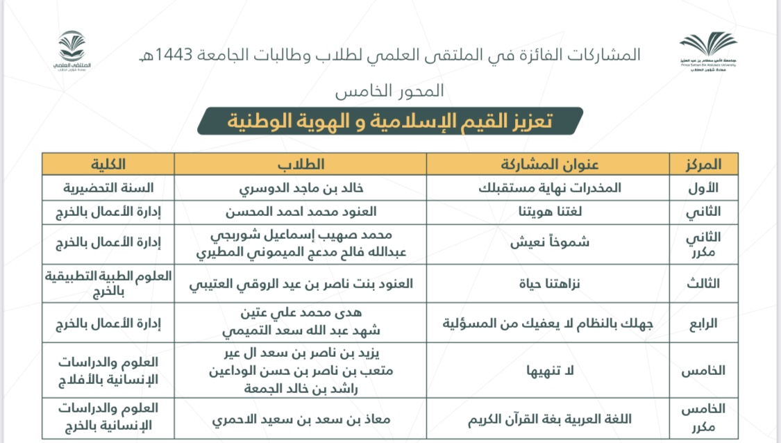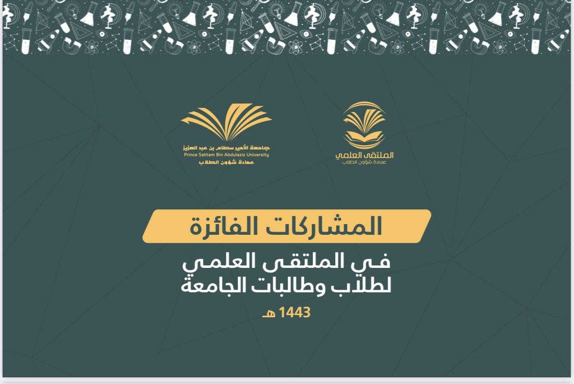 After an honorable competition between the participants of male and female students of Prince Sattam bin Abdulaziz University at the faculties and university levels, and under the patronage of His Excellency the President of the University, Prof. Abdul Rahman bin Hilal Al-Talhi, The final ceremony of the scientific forum for university students for the year 1443 AH was held on Wednesday, corresponding to 27/8/1443 AH.