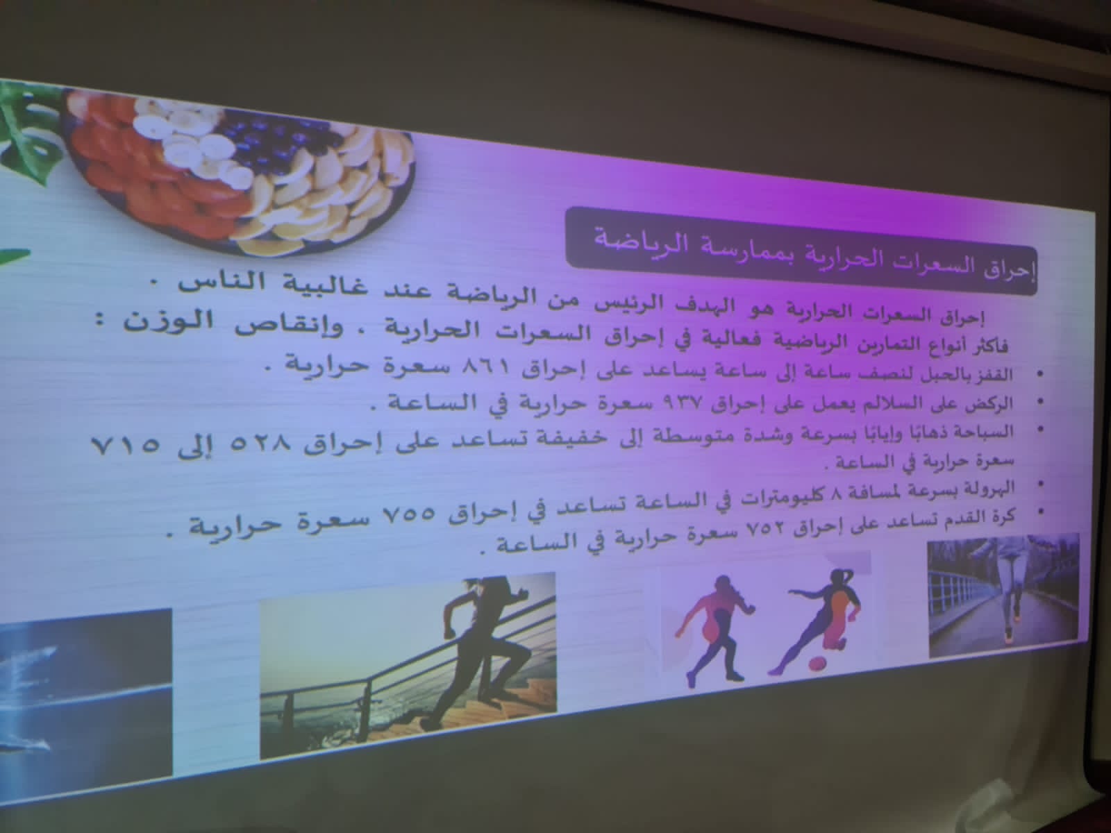 The Sports Activity Unit held a program (Sports and Calories) on Thursday, 28/8/1443 AH, at exactly nine thirty in the morning, under the supervision of the Sports Activity Supervisor, Ms. Nouf Rashid Al-Ajiri. The program began by explaining meaning of calories and the amount that an individual needs daily, followed by mentioning the efforts of the Ministry of Health in the Kingdom with regard to calories and the method of calculating them during the day, then presenting the most effective type of calorie-burning and calorie-reducing exercise.
