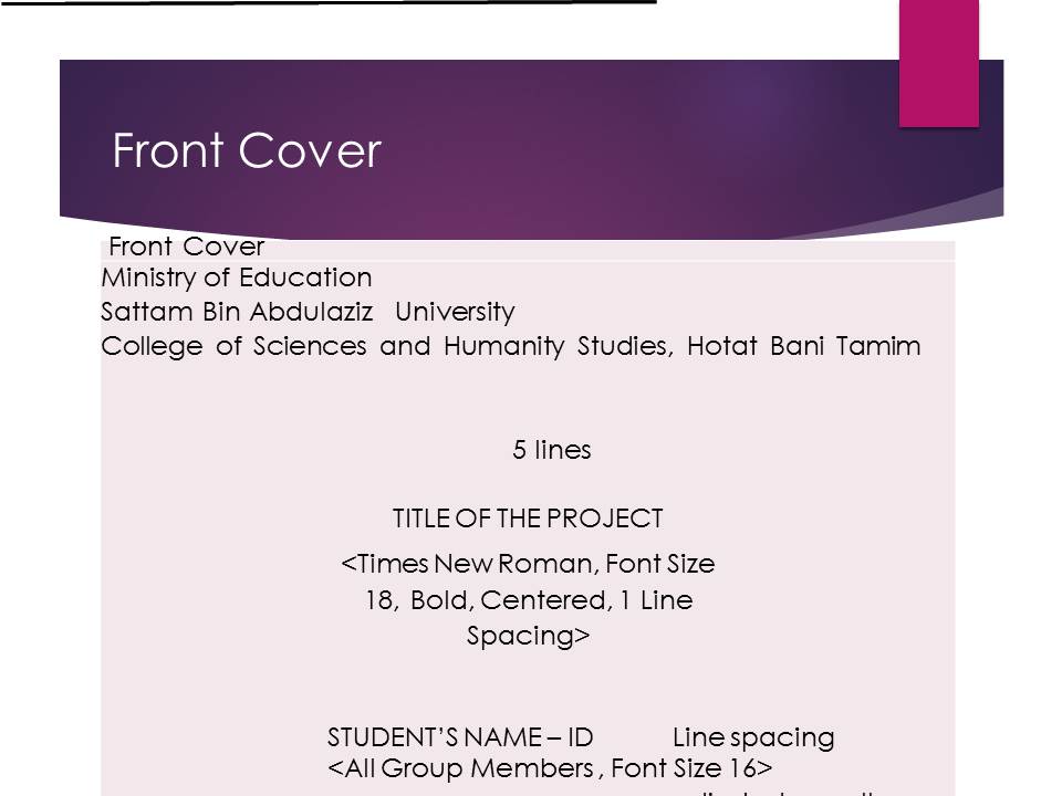 ضمن البرامج المقامة لتهيئة الخريجات للعمل على مشاريع التخرج ولتعريفهم لأساسيات البحث العلمي ومتابعة أداء الطالبات، قدم قسم اللغة الإنجليزية بالتعاون مع كل من لجنة مشاريع التخرج ووحدة الخريجات المحاضرة الثانية في تهيئة طالبات المستوى الثامن بقسم اللغة الإنجليزية لمشروع التخرج وذلك في يوم الأربعاء الموافق 13/07/1440هـ في قاعة رقم 3. قدمت المحاضرة الأستاذة ألفت راشد المحاضر بقسم اللغة الإنجليزية حيث استمرت لنصف ساعة بحضور 63 طالبة. تم خلال هذا البرنامج تعريف الطالبة على:تعريف الطالبات بWriting Project Report & Preparing PowerPoint presentation الرد على استفسارات الطالبات ومتابعه عملهم في المشروع.