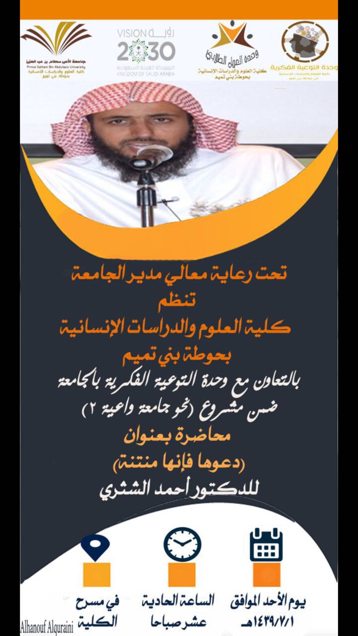 ضمن مشروع نحو جامعة واعية (٢) و تحت رعاية معالى مدير الجامعة، نظمت كلية العلوم والدراسات الإنسانية بحوطة بني تميم بقيادة عميدة الكلية الدكتورة حصة بنت سعود الهزاني و بالتعاون مع وحدة التوعية الفكرية بالجامعة محاضرة بعنوان(دعوها إنها منتنة) يقدمها سعادة الدكتور أحمد الشثري يوم الأحد الموافق 1 /7 / 1439 هـ