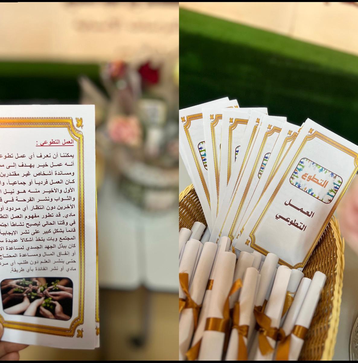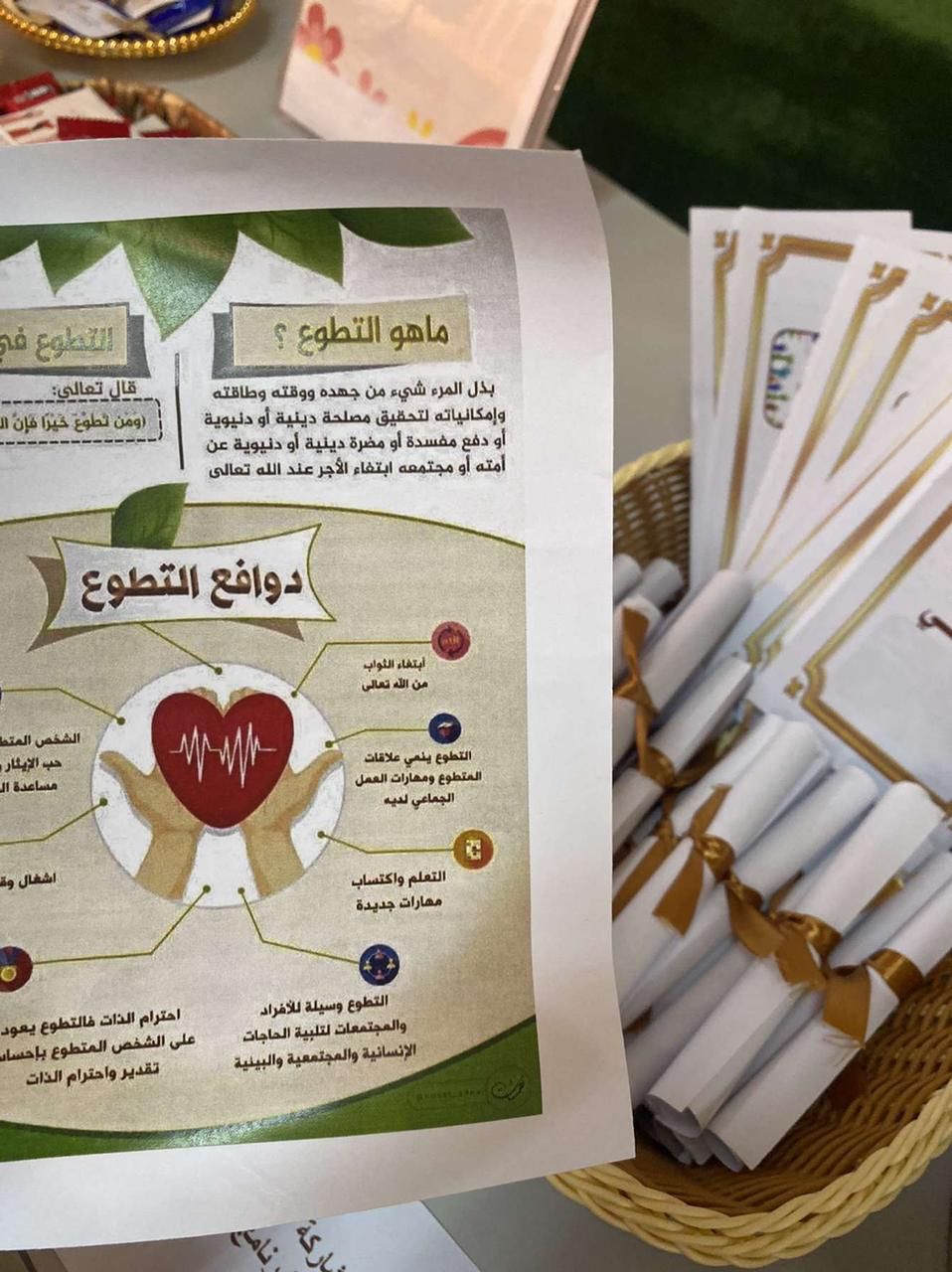 في نهاية الفعالية تم عرض فيديو قصير لأمثلة واقعية عن التطوع في حياة الأنبياء والصحابة وأدله من القرآن والسنة لإبراز فضل التطوع. كما اشتملت الفعالية على ركن يحتوي على نشرات وتوزيعات توعوية لحث الطالبات ومنسوبات الكلية بالأعمال التطوعية.