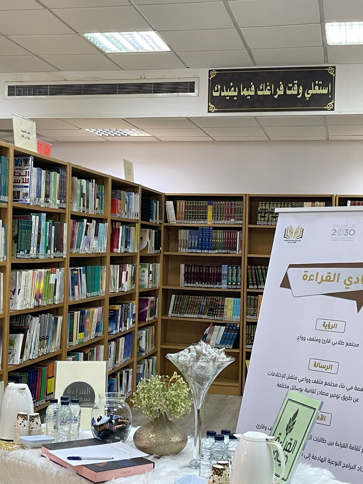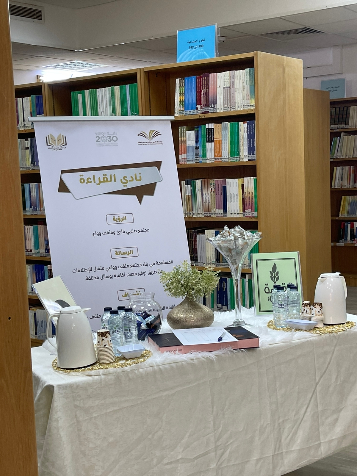تحت رعاية عميدة كلية العلوم والدراسات الإنسانية بحوطة بني تميم د. حصة بنت سعود الهزاني أعلنت المكتبة يوم الثلاثاء 1444/5/26هـ عن إنشاء نادي القراءة في المكتبة وتم استقبال الطالبات الراغبات بالانضمام للنادي وتسجيل بيناتهم المطلوبة ومن ثم تم الاجتماع بالطالبات المنظمات للنادي وتم عمل ما يلزم للنادي من: