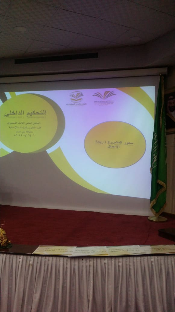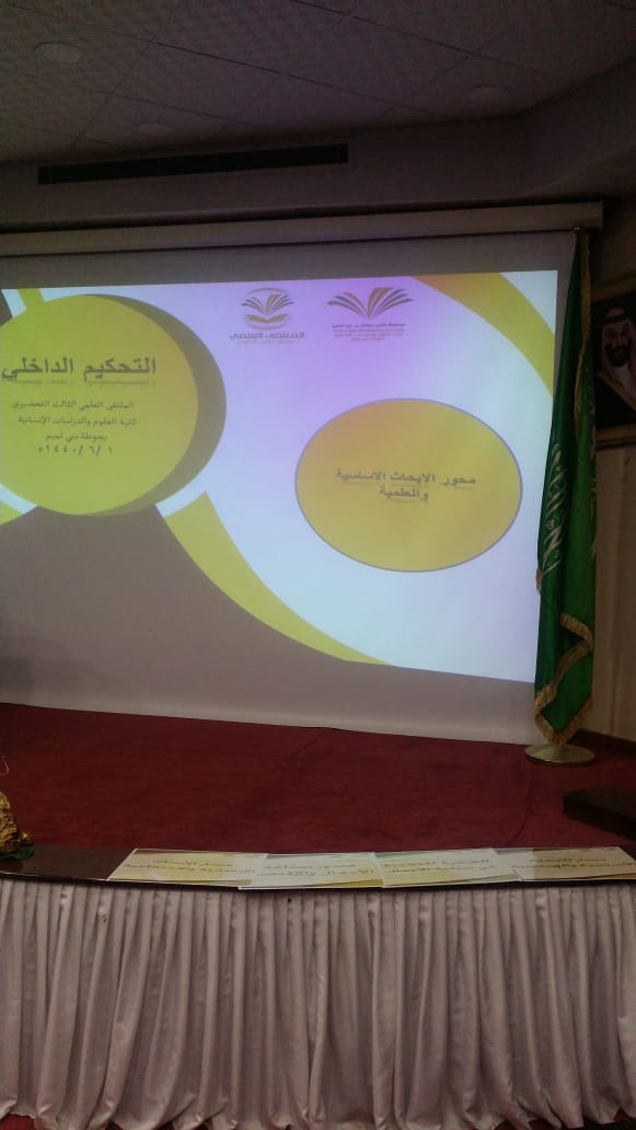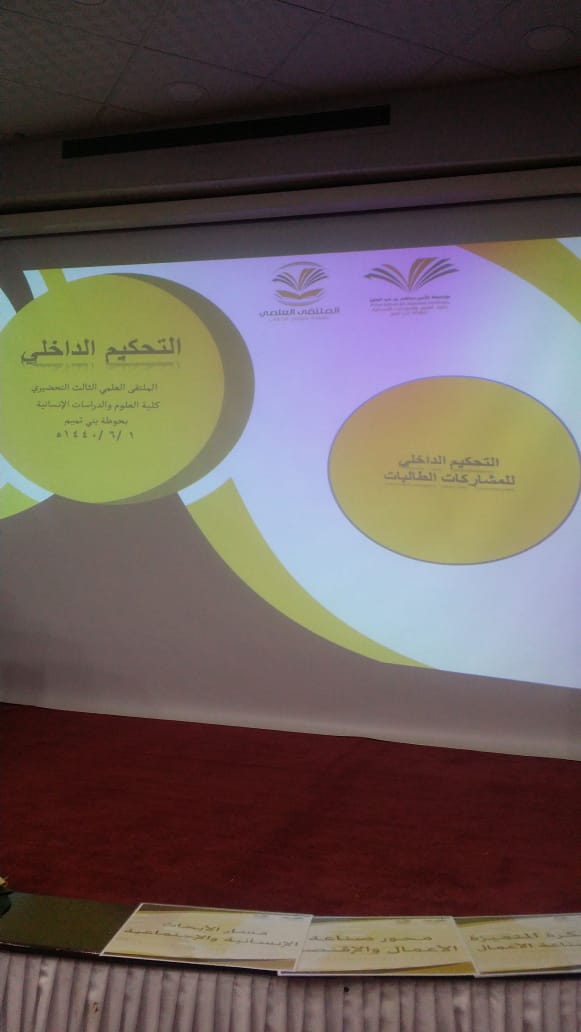 ضمن استعدادات التحضيرية للملتقى العلمي الثالث بكلية العلوم والدراسات الانسانية بحوطة بني تمي، نظمت لجنة الملتقى العلمي يوم الأربعاء الموافق ١/ 6/ 1440 هـ  برعاية عميدة الكلية الدكتورة حصة الهزاني وإشراف اللجنة التنظيمية فعالية التحكيم الداخلي للمشاركات.   تكونت اللجنة التحكيمية من عضوات واعضاء كلية العلوم وكلية إدارة الأعمال حيث تم تحكيم مشاركات الطالبات التي تم ترشيحها من داخل الكلية. حيت بدأت الفعالية بكلمة ترحيبية من قبل المنسقة العامة الأستاذة اسلام العمري وعرض المحاور التي تمت المشاركة بها ومن ثم تقديم اللجنة الخاصة بكل محور. تلاها البدء بتقديم الطالبات لعروضهن على خشبة المسرح في كل محور من محاور الملتقى حيث كما قامت اللجنة بمناقشة الطالبات وتسجيل الملاحظات على نماذج معايير تحكيم خاصة للمحاور والعروض. وفي الختام تم شكر اللجان والطالبات على ما بذلن من جهود مثمرة ومميزة.