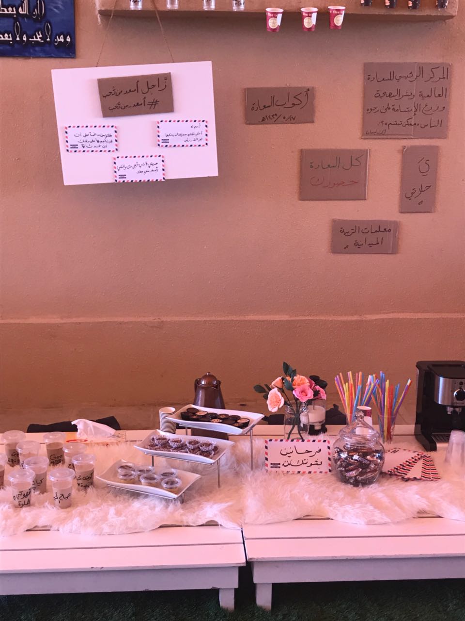 شاركن طالبات التربية الميدانية قسم الدراسات الإسلامية في كلية العلوم والدراسات الإنسانية بحوطة بني تميم مدرسة ثانوية تحفيظ القرآن بالحريق يوم الثلاثاء 27 / 5 / 1439 هـ بيومهم المفتوح بركن (أكواب السعادة). يهدف الركن إلى الدعوة إلى نشر السعادة وكيفية نشر السعادة ورسم الابتسامة على الوجوه احتوى الركن على طرق كثيره توصل للسعادة للنفس وللآخرين وتوزيعات ومنشورات عن كيف تسعد نفسك والآخرين.