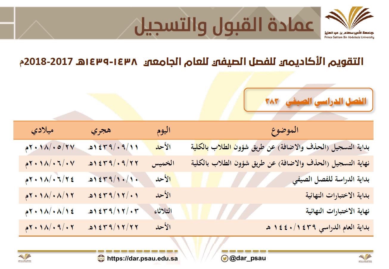 أعلنت عمادة القبول والتسجيل بجامعة الامير سطام بن عبد العزيز عن التقويم الأكاديمي المعتمد للفصل الدراسي الصيفي للعام 1438-1439هـ حسب التقويم المرفق. وفي هذا السياق تعلن كلية العلوم والدارسات الإنسانية بحوطة بني تميم عن بدء التسجيل للفصل الصيفي بالكلية وآليته حيث يتم استقبال طلبات التسجيل لفصل الصيفي يدوياً عن طريق وحدة التسجيل بمقر كلية العلوم والدراسات الانسانية بحوطة بني تميم على أسبوعين في الفترة ابتداءً من يوم الأحد 11/ 9/ 1439هـ وحتى يوم الخميس 22/ 9/ 1439 هـ. كما توضح الكلية للراغبات بالتسجيل بالترم الصيفي المقررات المتاحة للفصل الصيفي بكلية العلوم والدراسات الانسانية بحوطة بني تميم، وبأنه يسمح للطالبة الزائرة التسجيل بالفصل الصيفي حسب الالية المعلنة بالكلية، ولا يُسمح للطالبة بالاعتذار عن مقرر أو الفصل الصيفي بعد التسجيل.