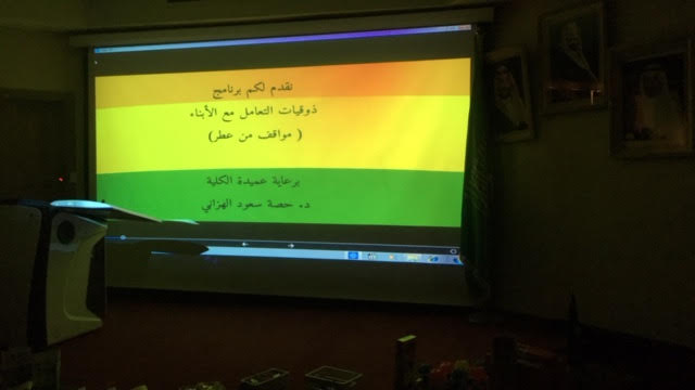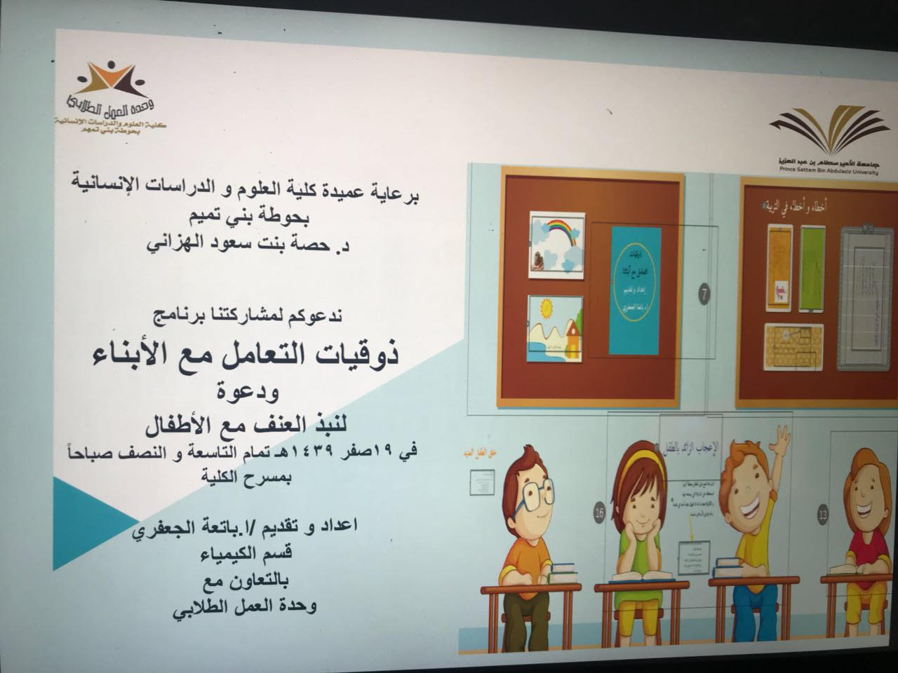 تحت رعاية عميدة كلية العلوم والدراسات الإنسانية بحوطة بني تميم الدكتورة حصة بنت سعود الهزاني، وبالتعاون مع وحده العمل الطلابي قدم قسم الكيمياء برنامج بعنوان ( ذوقيات التعامل مع الأبناء) يوم الاربعاء الموافق 19 /2 /1439هـ في مسرح الكلية. قدمت البرنامج الأستاذة باتعه الجعفري محاضر بقسم الكيمياء وتطرقت الى كيفية التعامل مع الابناء ونبذ العنف عند الاطفال وعن سلوكيات الاباء والامهات الخاطئة أثناء تربية أبنائهم وكيفية مواجهة المشاكل وطرق حلها مثل تدليل الأطفال، الاهمال، الطفل العنيد، الطفل المخرب، الأناني، المغرور ومشاكل الدراسة، الغيرة لدى بعض الاطفال، الكذب. كما تناولت مشاكل المراهقين وكيفية تضييق الفجوة بينهم وبين باقي أفراد الأسرة ومضار استخدام الجوالات وطرق تفاديها. وفي الختام قدمت بعض الهدايا والحلوى لطالبات والموظفات لإهدائها لأطفالهم ونتذكر دوماً ان الطفل يولد على الفطرة والوالدين هم من يشكل ويبث بداخله الصح والخطأ فلا بد من الاهتمام به بشكل أكبر وسائلين الله بأن تدوم المحبة بين الابناء وأسرهم.