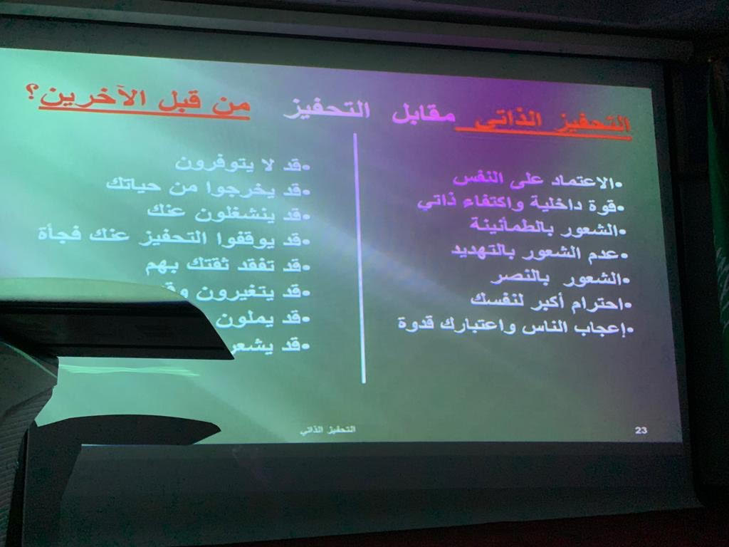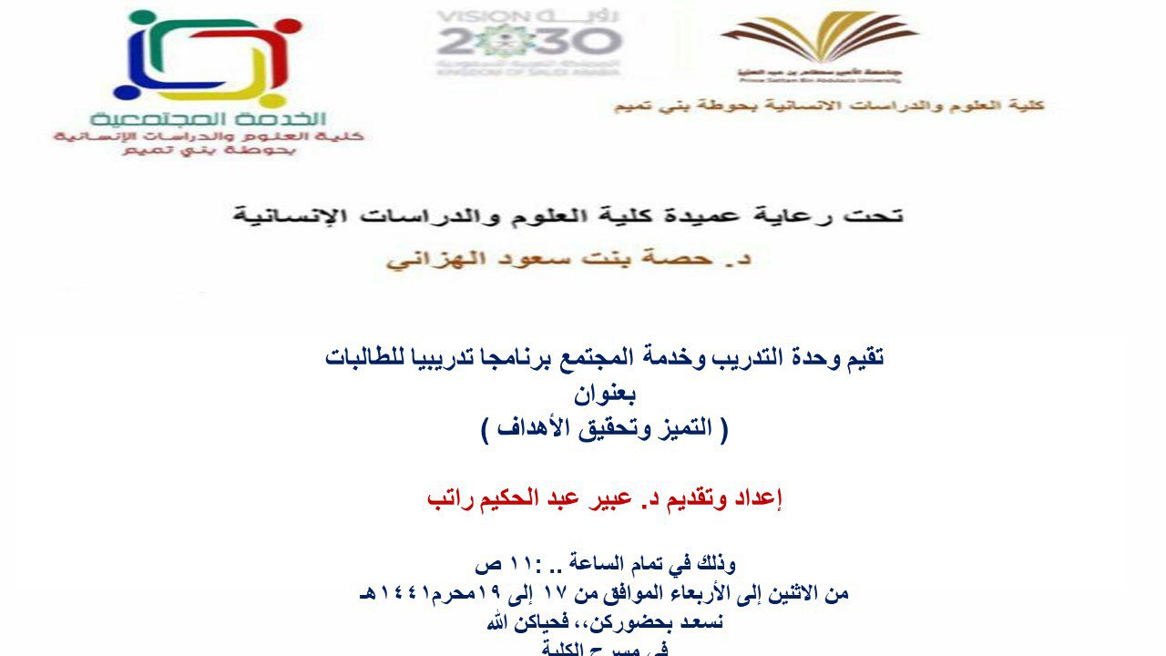 أقامت كلية العلوم والدراسات الإنسانية بحوطة بني تميم تحت قيادة عميدة الكلية د. حصة بنت سعود الهزاني، وبإشراف وحدة التدريب والخدمة المجتمعية، برنامج تدريبي للطالبات على مدار ثلاثة أيام متواصلة بعنوان "التميز وتحقيق الأهداف " تقديم د. عبير عبد الحكيم, ويندرج تحت هذا العنوان ثلاثة محاور وهي: التحفيز الذاتي - الإدارة الفعالة للوقت - التخطيط لتحقيق الأهداف، بهدف تحفيز الطالبات لاكتساب عادات الناجحين، وابتداء من يوم الأثنين الموافق ١٤٤١/١/١٧ هـ في تمام الساعة الحادية عشرة صباحاً وانتهاء بيوم الأربعاء ١٤٤١/١/١٩ هـ في مسرح الكلية ، وقُدّم لكل يوم تدريبي حقيبة تدريبية للمشاركات و عرض تقديمي يتضمن أنشطة وفيديوهات وقصص ، لتشجيع الطالبات للتخطيط والإدارة الناجحة للوقت، قدم البرنامج هديته (مفكرة وقلم) وشهادة حضور للمشاركات . وقد شهد البرنامج التدريبي حضوراً و تفاعلاً من بعض طالبات أقسام: اللغة العربية، الكيمياء، اللغة الإنجليزية، الدراسات الإسلامية.