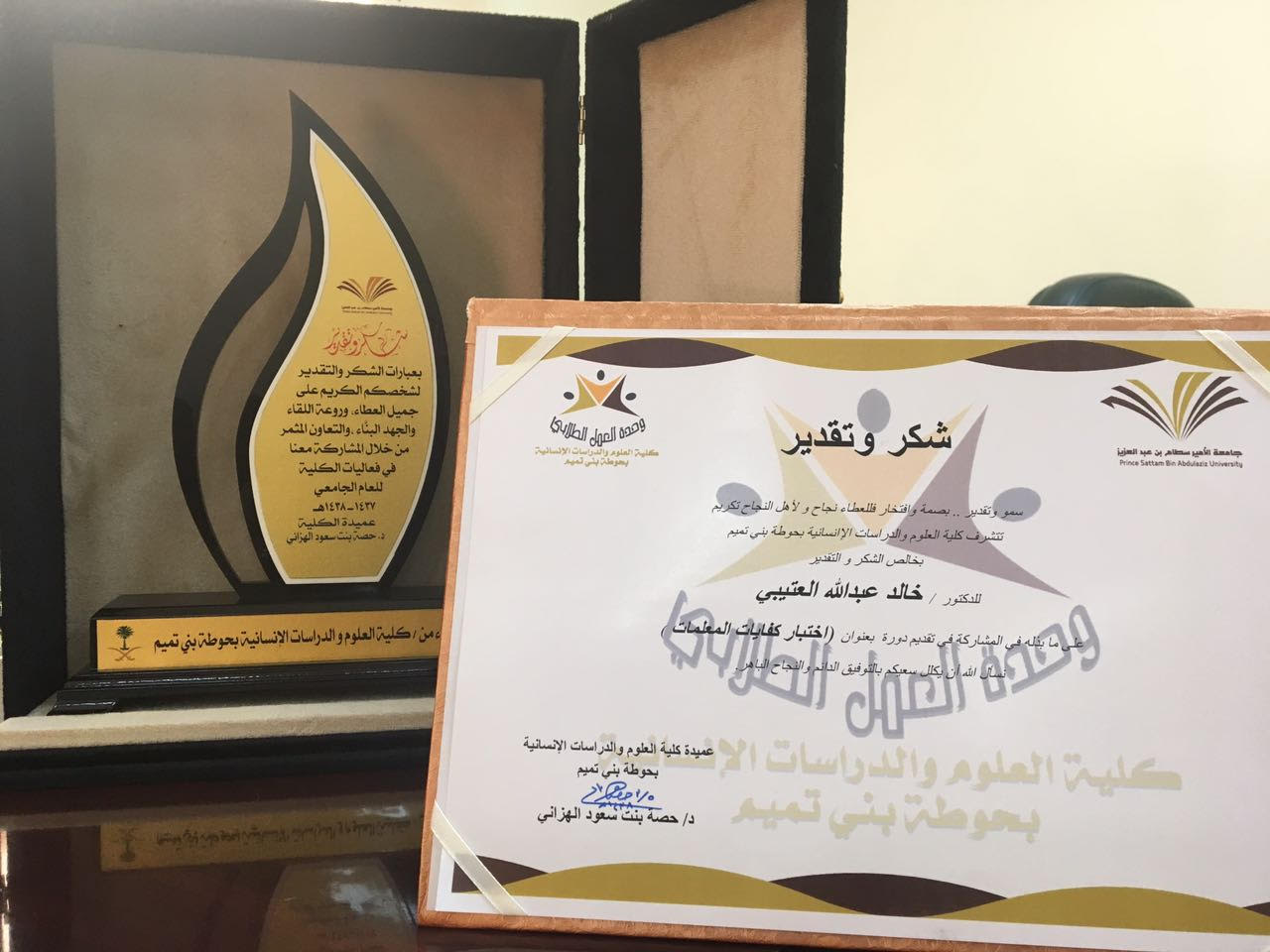 نظّمت وحدة الخريجات بالتعاون مع وحدة العمل الطلابي بكلية العلوم والدراسات الإنسانية بحوطة بني تميم دورة بعنوان (اختبار كفايات المعلمات) قدمها د. خالد بن عبدالله العتيبي عميد كلية إدارة الأعمال والمستشار في مركز قياس سابقاً وذلك يوم الأحد الموافق 5/ 3/ 1438هـ في مسرح الكلية. وقد احتوت الدورة على عدة محاور منها الخلفية التاريخية للاختبار وماهو الاختبار وآلية إعداد معاييره وأمثلة لاختبارات سابقة. وفي نهاية الدورة أجاب الدكتور على استفسارات الحاضرات كما قدمت عميدة الكلية د. حصة الهزاني شكرها وتقديرها للدكتور خالد على مابذله من جهد ووقت لتقديم هذه الدورة وتم تسلميه شهادة شكر ودرع تقديرًا لجهده المبذول. هذا وقد شهدت الدورة حضورًا كثيفًا من خريجات الكلية وخريجات جامعات أخرى.