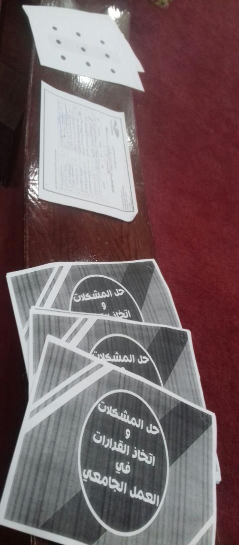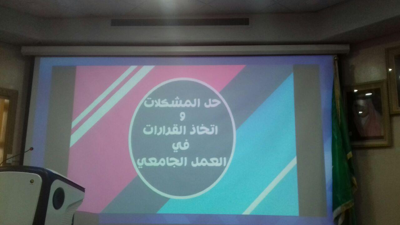أقامت وكالة الجامعة للشؤون التعليمية والأكاديمية ممثلة في الوحدة الإشرافية على كليات البنات بكلية العلوم والدراسات الإنسانية بحوطة بني تميم دورة تدريبية بعنوان (حل المشكلات واتخاذ القرار في العمل الجامعي) وذلك يوم الأحد الموافق 29 /5 /1438هـ للدكتور محمد المهيزع عميد كلية طب الأسنان بجامعة الأمير سطام بن عبدالعزيز. وقد تضمنت الدورة المحاور الآتية: المشكلات مفهومها وأنواعها، وأهمية التعرف على المشكلات، وخطوات حل المشكلات، ودور أنماط الشخصية في مواجهة المشكلات، وكذلك دور الإبداع والعمل الجماعي في حل مشكلات العمل، وبناء فريق العمل لحل المشكلات والأساليب العلمية لحل المشكلات ومهارات وأدوات جمع وتحليل البيانات، وخطوات تحليل المشكلات والتعرف على أبعادها باستخدام نماذج مختلة، وأيضًا مهارات التفكير والقرار مفهومه وأهميته والأبعاد ذات العلاقة، وأنواع القرارات والمعالجات وتصميم خطة للعمل وأخيرًا التقييم (ملامح ومحفزات ومؤشرات). وقد بلغ عدد الحاضرات مايزيد على عشرين عضوة من عضوات هيئة التدريس، وقد تم تزويدهن بالحقيبة التدريبية وتم خلال الدورة ممارسة بعض الأنشطة والتطبيقات العملية. وبعد انتهاء الدوره تم إرسال تقييم للدورة التي  تمت بنجاح ولله الحمد.