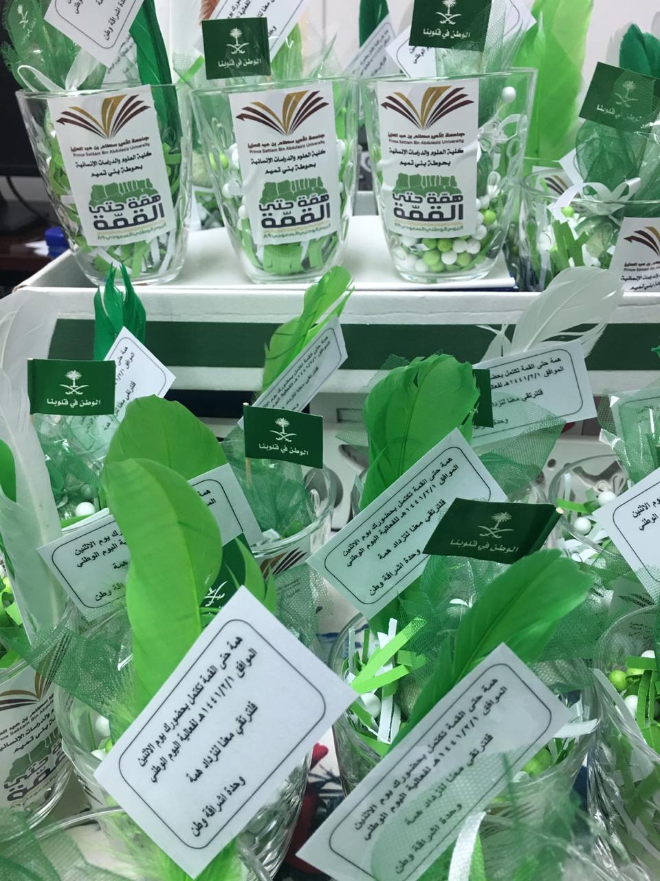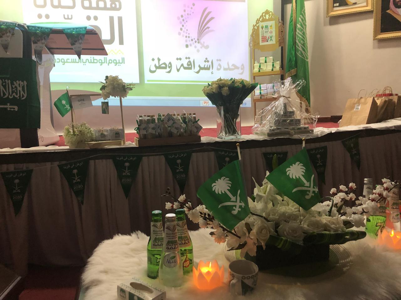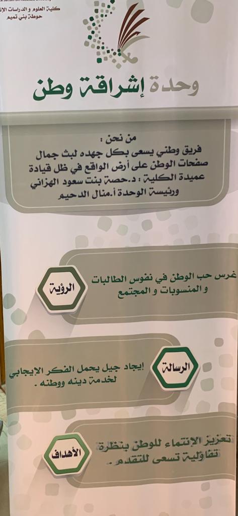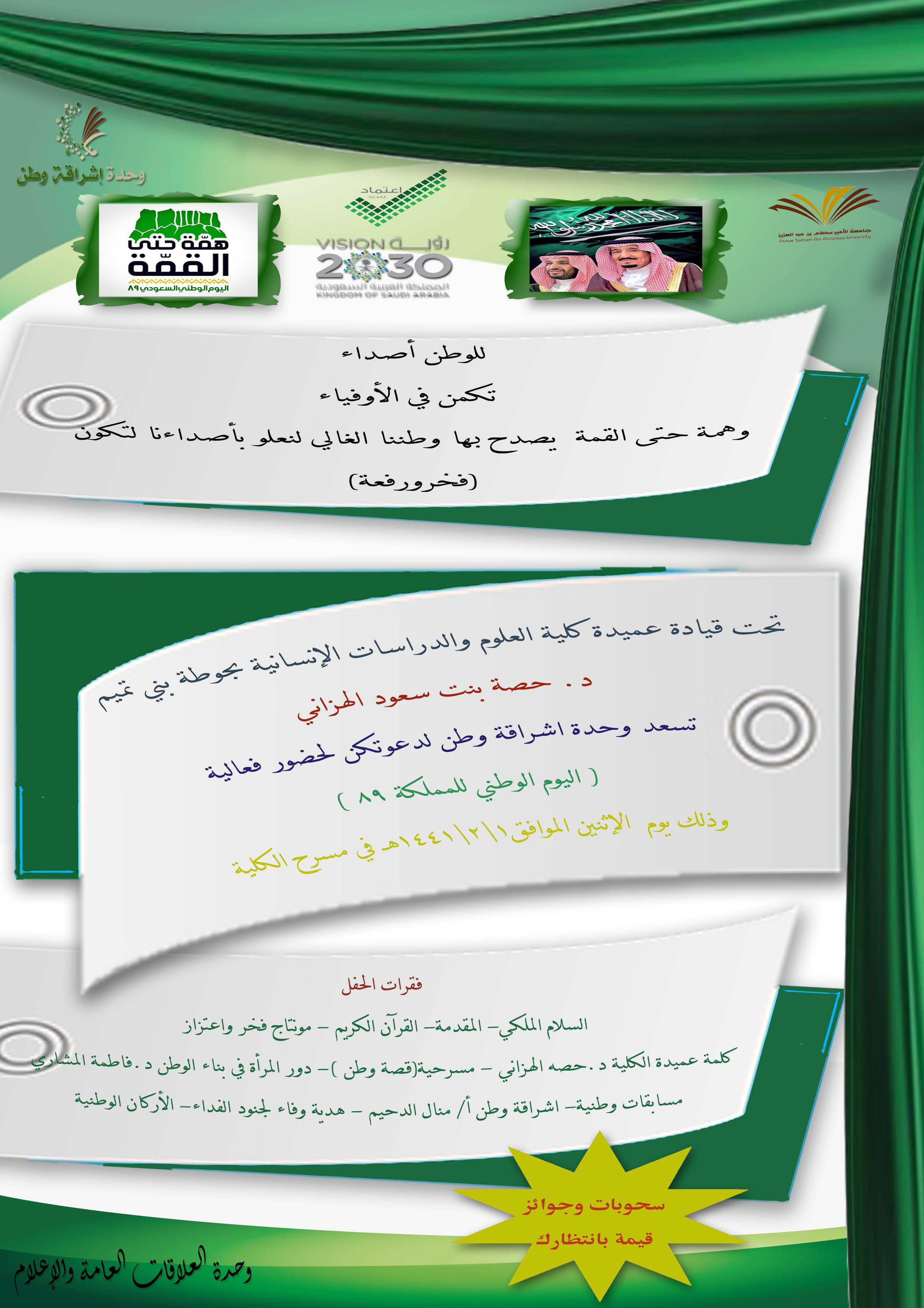 في يوم بهيج يسطع للدنيا نور الذكرى التاسع والثمانون لتأسيس المملكة العربية السعودية، ليكون حقا لكل مواطن الفخر والعزة بهذا التأسيس. ليسطع خفاقا في قلوب كل مواطنة تقبع هذه الارض الرحبة؛ لتضج الدعوات بحضور فعالية الفخر بهذا الوطن المعطاء؛ فتحلق الاعلام خفاقة في كلية العلوم والدراسات الانسانية بحوطة بني تميم في يوم الاثنين الموافق ١٤٤١/٢/١هـ وبتمام الساعة ٩:30 صباحا حيث انطلقت الفعالية من وحدة اشراقة وطن تحت قيادة عميدة الكلية د. حصه بنت سعود الهزاني حيث ارتدى المسرح اللون الأخضر والأبيض مدويا نحن "همة حتى القمه "، ليبدأ البرنامج بالسلام الملكي باللغة العربية واللغة الإنجليزية ومن ثم قدمت الطالبة هديل الرقدي مقدمة فيها الحمد والثناء والبهجة والبهاء، ليتبعها مونتاج يحكي همة حتى القمة، ومن بعده تقدمت عميدة الكلية بكلمتها التي بينت فيها أهمية هذه المناسبة وأننا كلنا للوطن وفخرنا اليوم لا يعادله فخر وعلينا أن نقدم ما في وسعنا لخدمة الدين والوطن، ومن ثم بدأت مسرحية قصة وطن تحكي ما وصل له الوطن من تقدم وعلو، ومن بعدة كلمة بعنوان "دور المرأة في بناء الوطن" قدمتها د. فاطمه المشاري حيث ركزت على نماذج المرأة في العصر القديم والحديث والدور الذي قدمته. بعدها تقدمت طالبة تحكي مشاعرها للوطن، وسما الحفل بمسابقات وطنية أضفت روح الثقافة والمرح على الحاضرات وفِي موجات الفعالية وقفت وحدة اشراقة وطن بإشراف أ/ منال الدحيم على الجنود البواسل الذين يبقى ذكرهم ووهجهم في كل حين لنفخر بشهدائهم ونقدم لهم هدية وفاء لجنود الفداء وهو وقف دعوي. لتتقدم في ختام الفعالية عميدة الكلية بمناسبة اليوم الوطني بسحوبات وجوائز قيمة أثارت الحماس في نفوس الطالبات ولمس الأثر عليهن واختتم البرنامج بهدايا من اشراقة وطن لشركاء النجاح من جميع أقسام الكلية والنوادي والمجالس الطلابية والعلاقات العامة. وتم الانطلاق للمعرض المصاحب للفعالية حيث توسم بوشاح الفخر من طالبات القمه وتواقيع بصمت أجمل معاني حب الوطن. ولم يكن المحيط الخارجي للكلية مجهولا في هذا اليوم بل كانت الهدايا الوطنية لأولياء الامور مرسما ومعلما لهذا اليوم.