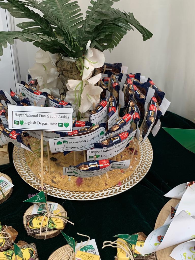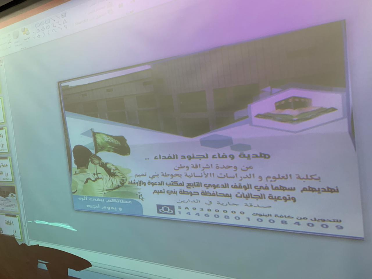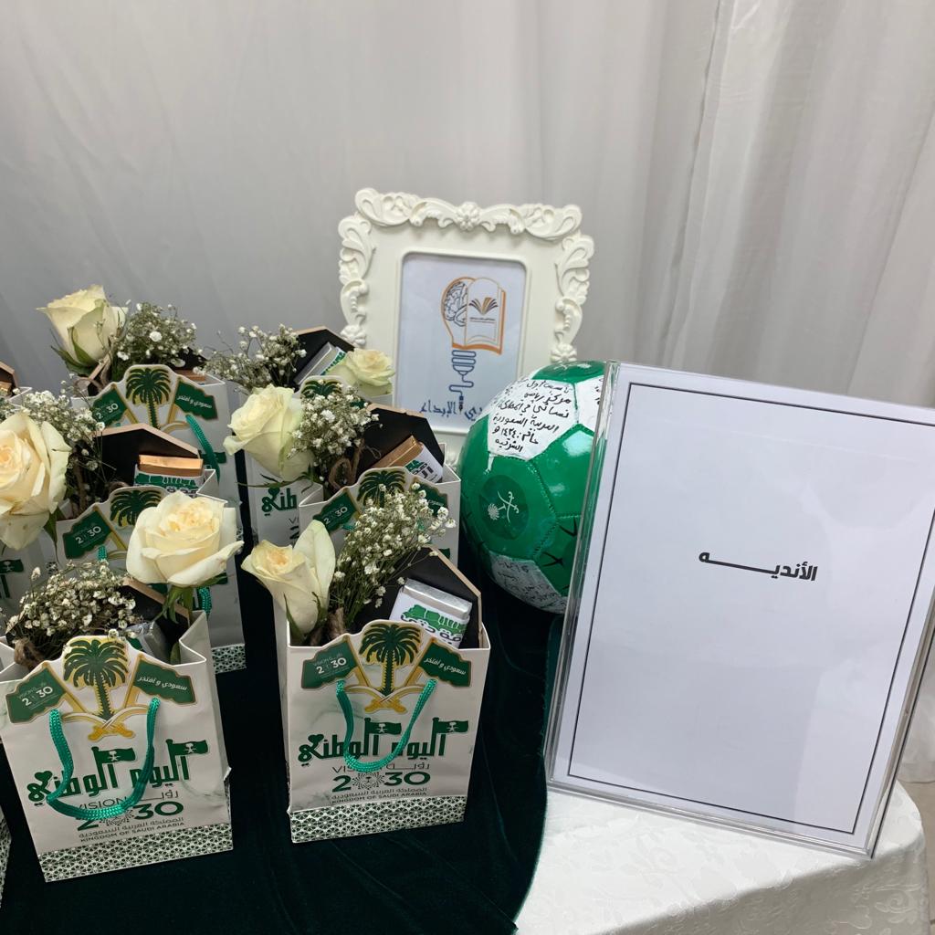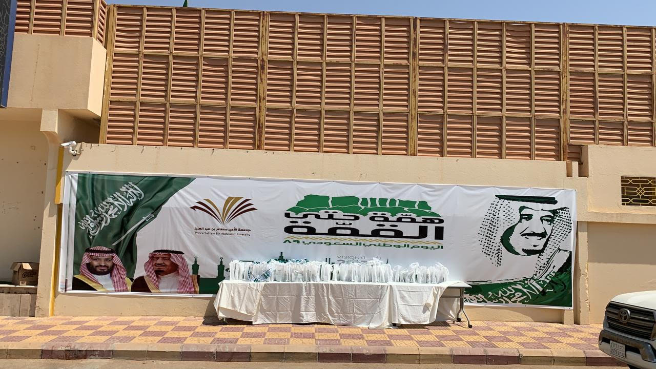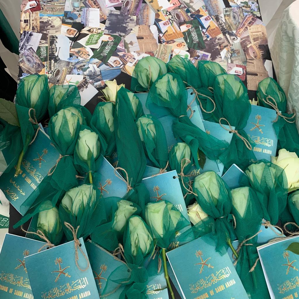 في يوم بهيج يسطع للدنيا نور الذكرى التاسع والثمانون لتأسيس المملكة العربية السعودية، ليكون حقا لكل مواطن الفخر والعزة بهذا التأسيس. ليسطع خفاقا في قلوب كل مواطنة تقبع هذه الارض الرحبة؛ لتضج الدعوات بحضور فعالية الفخر بهذا الوطن المعطاء؛ فتحلق الاعلام خفاقة في كلية العلوم والدراسات الانسانية بحوطة بني تميم في يوم الاثنين الموافق ١٤٤١/٢/١هـ وبتمام الساعة ٩:30 صباحا حيث انطلقت الفعالية من وحدة اشراقة وطن تحت قيادة عميدة الكلية د. حصه بنت سعود الهزاني حيث ارتدى المسرح اللون الأخضر والأبيض مدويا نحن "همة حتى القمه "، ليبدأ البرنامج بالسلام الملكي باللغة العربية واللغة الإنجليزية ومن ثم قدمت الطالبة هديل الرقدي مقدمة فيها الحمد والثناء والبهجة والبهاء، ليتبعها مونتاج يحكي همة حتى القمة، ومن بعده تقدمت عميدة الكلية بكلمتها التي بينت فيها أهمية هذه المناسبة وأننا كلنا للوطن وفخرنا اليوم لا يعادله فخر وعلينا أن نقدم ما في وسعنا لخدمة الدين والوطن، ومن ثم بدأت مسرحية قصة وطن تحكي ما وصل له الوطن من تقدم وعلو، ومن بعدة كلمة بعنوان "دور المرأة في بناء الوطن" قدمتها د. فاطمه المشاري حيث ركزت على نماذج المرأة في العصر القديم والحديث والدور الذي قدمته. بعدها تقدمت طالبة تحكي مشاعرها للوطن، وسما الحفل بمسابقات وطنية أضفت روح الثقافة والمرح على الحاضرات وفِي موجات الفعالية وقفت وحدة اشراقة وطن بإشراف أ/ منال الدحيم على الجنود البواسل الذين يبقى ذكرهم ووهجهم في كل حين لنفخر بشهدائهم ونقدم لهم هدية وفاء لجنود الفداء وهو وقف دعوي. لتتقدم في ختام الفعالية عميدة الكلية بمناسبة اليوم الوطني بسحوبات وجوائز قيمة أثارت الحماس في نفوس الطالبات ولمس الأثر عليهن واختتم البرنامج بهدايا من اشراقة وطن لشركاء النجاح من جميع أقسام الكلية والنوادي والمجالس الطلابية والعلاقات العامة. وتم الانطلاق للمعرض المصاحب للفعالية حيث توسم بوشاح الفخر من طالبات القمه وتواقيع بصمت أجمل معاني حب الوطن. ولم يكن المحيط الخارجي للكلية مجهولا في هذا اليوم بل كانت الهدايا الوطنية لأولياء الامور مرسما ومعلما لهذا اليوم.