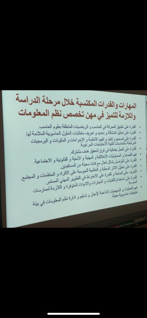 سعيا للاهتمام بمستقبل الطالبات، وفي ظل قيادة عميدة كلية العلوم و الدراسات الإنسانية بحوطة بني تميم سعادة د. حصة بنت سعود الهزاني الفاضلة، وضمن فعاليات لجنة الإرشاد المهني بوحدة الخريجات قدمت د. هبة الله أحمد الويشي الأستاذ المساعد و المشرفة على قسم نظم المعلومات فعالية : "التصنيف المهني لتخصص نظم المعلومات مسار الأعمال الإلكترونية" يوم الأحد الموافق : ١٤٤١/٢/١٤هـ بإحدى قاعات المبنى الرئيسي و بحضور (28) طالبة. بدأت الفعالية بالتعريف بالتخصص و القدرات الشخصية التي يجب توافرها في طالبات تخصص نظم المعلومات، كما تضمنت التعريف بالمسميات الوظيفية لمهن التخصص مسار الأعمال الإلكترونية و القدرات و المهارات التي تكتسبها طالبات التخصص، وقد تطرقت للشهادات المهنية التي تدعم المتخصص في مجال نظم المعلومات و التدريب المهني المصاحب لمسار الأعمال الإلكترونية. و في نهاية اللقاء فتحت الجلسة للنقاش و الرد على استفسارات الطالبات اللاتي أعربن عن تحمسهن لتنمية قدراتهن في مجال تخصص نظم المعلومات. ولقيت الفعالية تفاعلا من جميع الطالبات.
