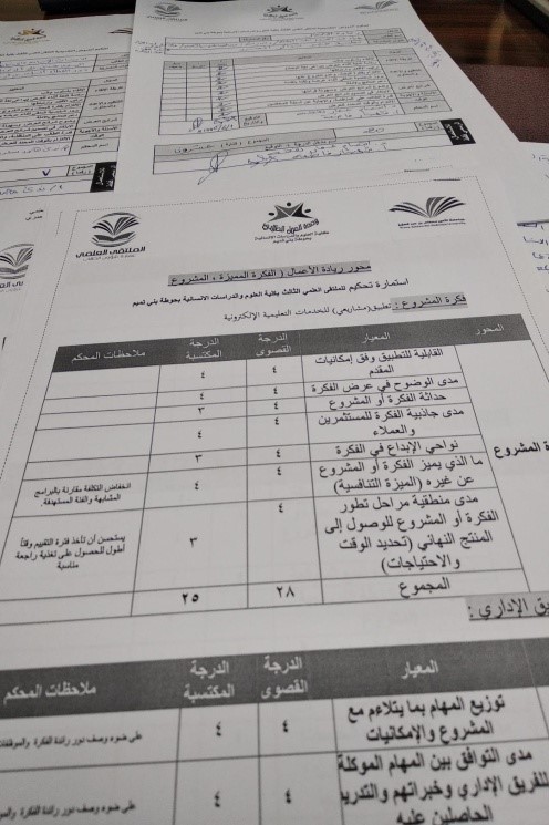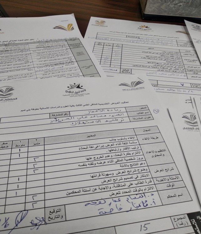 عقدت لجنة الملتقى العلمي الثالث بكلية العلوم والدراسات الانسانية بحوطة بني تميم الاجتماع لفرز نتائج التحكيم الداخلي لمشاركات الطالبات يوم الأحد الموافق 5/ 6/ 1440 هـ الساعة العاشرة صباحاً بمسرح الكلية. حيث قامت اللجنة بتقييم المشاركات النهائية واستلام نتائج لجنة التحكيم وفرزها وإصدار المراكز على مستوى الكلية. تم تقديم (9) مشاركات مقسمة على المحاور وتم استبعاد مشاركة واحدة لعدم توفير معايير التقييم فيها. جاءت نتائج واحصائيات المشاركات في محاور الملتقى كالتالي: محور الأبحاث العلمية (مسار: الابحاث الاساسية والعلمية ) (مشاركة واحدة)محور الأبحاث العلمية (مسار : الأبحاث الصحية) (مشاركة واحدة)محور: الأبحاث العلمية (مسار: الأبحاث الإنسانية والاجتماعية/ فرع:الأبحاث العامة) (مشاركة واحدة)محور:صناعة الأعمال والاقتصاد (مسار :الفكرة المتميزة في صناعة الأعمال) (مشاركتان)محور:المبادرات المجتمعية والتطوعية (مسار:الأفكار الريادية للمبادرات المجتمعية والتطوعية) (مشاركة واحدة)محور الإفلام التوعوية (مشاركة واحدة)