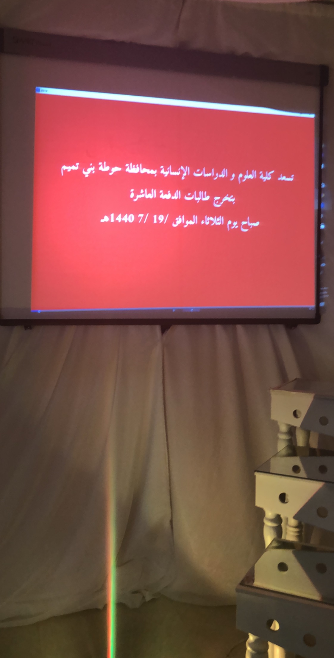 نظمت كلية العلوم والدراسات الانسانية بحوطة بني تميم حفل تخريج الدفعة العاشرة مرحلة البكالوريوس من طالبات الكلية في يوم الثلاثاء 18 / ٧ / 1440 هـ بمركز الأنشطة الطلابية بالمحافظة تحت رعاية سعادة عميدة الكلية الدكتورة حصة الهزاني وبحضور قيادات الكلية الدكتورة مي مصطفى ووكيلة الكلية للشؤون الادارية والمالية الأستاذة تهاني الجويعد ووكيلة الجودة الأستاذة فاطمة الكليب ورئيسات الأقسام وعدد كبير من أعضاء هيئة التدريس والطاقم الاداري وأمهات الخريجات.بدأ الحفل بالسلام الوطني تلاه مسيرة الخريجات لمختلف التخصصات، بعدها بدأ الحفل الخطابي الذي أُستهل بتلاوة آيات من القرآن الكريم، تلتها الطالبة أماني القريني من قسم اللغة الإنجليزية. بعد ذلك ألقت سعادة عميدة الكلية الدكتورة حصة الهزاني كلمة بهذه المناسبة قدمت من خلالها الشكر والتقدير لحكومتنا الرشيدة وقياداتها على ما تولية من دعم واهتمام للتعليم الجامعي وللفتاة السعودية بشكل خاص، كما قدمت سعادتها العديد من الوصايا للخريجات متمنية لهم دوام التوفيق وموضحة أن هذه الفترة تعتبر بداية لمرحلة جديدة من تحقيق الذات والنهوض بالوطن نحو ما يتوافق مع رغباتهن وميولهن، كما اختتمت كلمتها بالشكر لجميع الحضور على مشاركة منسوبات الكلية بهذا الاحتفال.ثم ألقت الطالبة فاطمة العثمان كلمة الخريجات، نيابة عنهن شكرت فيها الضيوف من قيادات الكلية على مشاركتهن الطالبات هذا الحفل وفرحة الإنجاز والتخرج، كما أشارت في كلمتها إلى ما حظيت به وزميلاتها الخريجات من رعاية واهتمام من قبل عميدة الكلية والادارة والطاقم التدريسي خلال المسيرة الدراسية. عقب ذلك عُرض فيلم وثائقي يحكي قصة الكلية وما أحرزته من انجازات، كما تم عرض قصة رحلة الدراسة للخريجات منذ بداية المراحل الدراسية وحتى يوم التتويج بالتخرج. وفي ختام فقرات الحفل كرمت سعادة عميدة الكلية الخريجات بدءاً بالطالبات الحاصلات على مراتب الشرف الأولى والثانية ثم جميع الخريجات. واختتم الحفل بدعوة الحاضرات بالتوجه للضيافة التي أْعدت لهذه المناسبة.