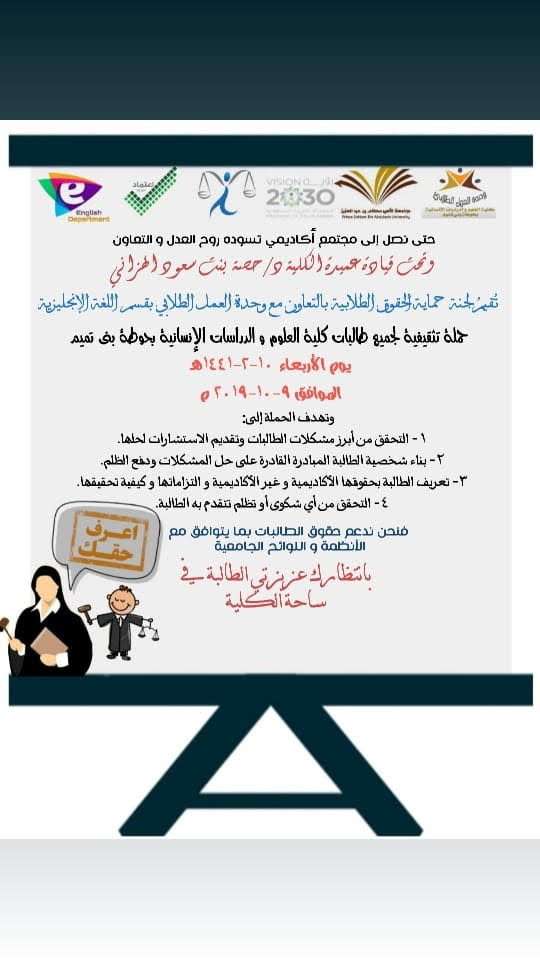 حتى نصل إلى مجتمع أكاديمي تسوده روح العدل و التعاون، و تحت قيادة سعادة عميدة الكلية د. حصة بنت سعود الهزاني، أقامت لجنة حماية الحقوق الطلابية بالتعاون مع وحدة العمل الطلابي حملة تثقيفية لجميع طالبات كلية العلوم والدراسات الإنسانية بحوطة بني تميم بقسم اللغة الإنجليزية، يوم الأربعاء الموافق ١٤٤١/٢/١٠هـ في بهو الكلية. بُدئت الحملة بنقاش أ. شروق الحميضي مع الطالبات لبعض من حقوقهن و التزاماتهن الأكاديمية وغير الأكاديمية، و قد سعت الحملة إلى تحقيق الجوانب التالية: التعرف على أبرز مشكلات الطالبات و السعي لحلها- تثقيف الطالبات بواجباتهن وحقوقهن- تعريف الطالبات بلجنة الحقوق الطلابية و كيفية التواصل مع أعضائها. كما تم توزيع منشورات توضح للطالبات أبرز مهامهن و التزاماتهن، إضافة إلى منشورات بسيطة تم توزيعها في مكاتب الأعضاء لتذكيرهن بأبرز الحقوق الطلابية. واختتمت الحملة التوعوية بتسجيل أسماء جميع الطالبات المستفيدات منها، وشكرهن على الحضور.