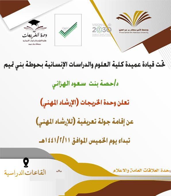 في خضم برامج التوعية لطالبات كلية العلوم والدراسات الإنسانية بحوطة بني تميم و تحت قيادة عميدة الكلية د. حصة بنت سعود الهزاني، نظّمت وحدة الخريجات جولة تعريفية بالإرشاد المهني بدأت في يوم الأحد الموافق 11 / 2/ 1441هـ استمرت الجولة أربعة أيام. هدفت الجولة إلى توعية الطالبات المستجدات بكيفية اختيار التخصص المناسب، واكتشاف الذات، و التعرف علي الميول، و نشر ثقافة الإرشاد المهني، و تبصير الطالبات بمهن المستقبل والوظائف المتاحة في سوق العمل. وجدت الجولة استحسان من الطالبات وتفاعل بينهن، كما طُرحت بعض الأفكار من قبل الطالبات.