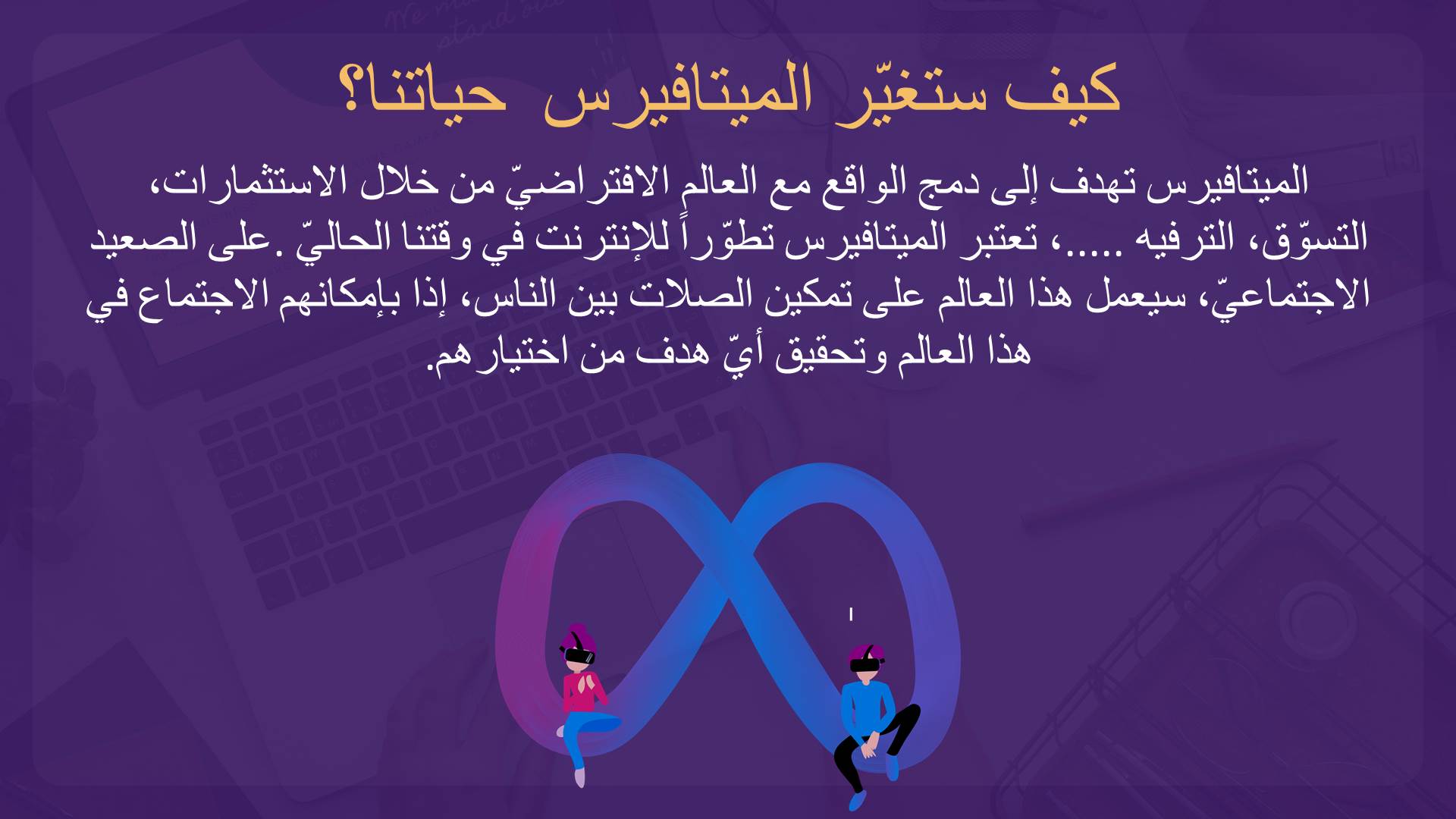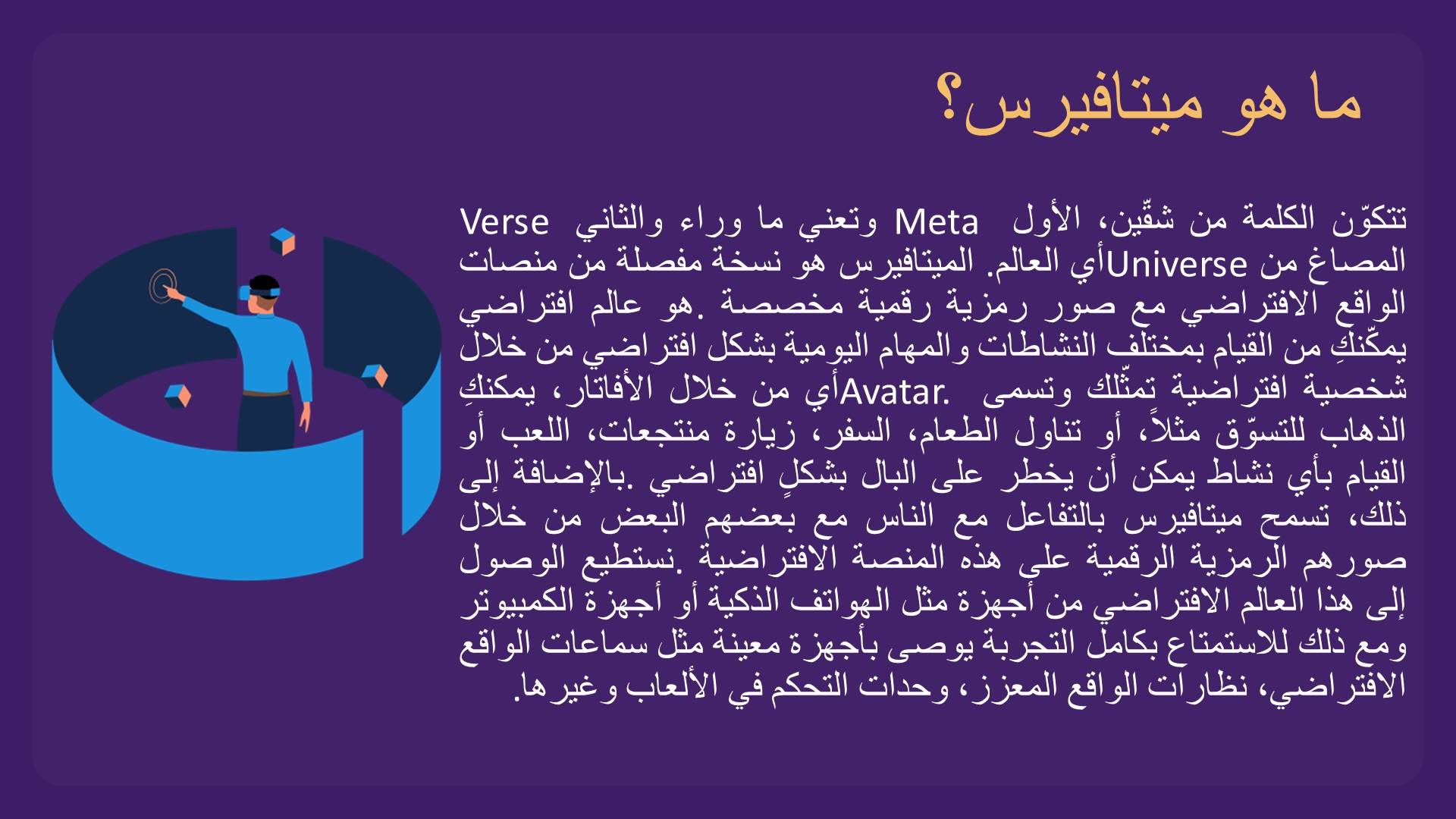 تعد التقنيات جزء من التكنولوجيا ممثلة في طرق لإنشاء الأدوات والمنتجات الجديدة بفعل الإنسان الذي يتميز بقدرته على الابتكار وتعديل البيئة المحيطة به بوعي. واليوم مع تسارع هذا التقدم التكنولوجي وما يلحق به من مزايا وعيوب وتأثيره على التطور الكامل للبشرية بإيجابياتة وانتكاساته تظهر مصطلحات جديدة يشوبها الكثير من الغموض ويحيط بها العديد من التساؤلات والاستفسارات منها الميتافيرس وويب3. ولأهمية وخطورة المصطلحين، وبرعاية عميدة كلية العلوم والدراسات الإنسانية بحوطة بني تميم د/ حصة بنت سعود الهزاني أقامت طالبات قسم نظم المعلومات بإشراف د/ هبة الله أحمد الويشي فعالية بعنوان " الميتافيرس باستخدام تقنيات الواقع المعزز وتأثيره على مستقبل الإنترنت" وذلك يوم الثلاثاء الموافق 26/8/1443 هـ - 29/3/2022 م في تمام الساعة العاشرة والنصف صباحاً بمسرح الكلية.