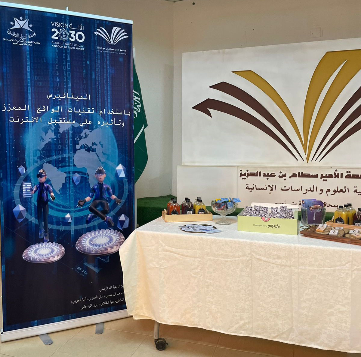 تعد التقنيات جزء من التكنولوجيا ممثلة في طرق لإنشاء الأدوات والمنتجات الجديدة بفعل الإنسان الذي يتميز بقدرته على الابتكار وتعديل البيئة المحيطة به بوعي. واليوم مع تسارع هذا التقدم التكنولوجي وما يلحق به من مزايا وعيوب وتأثيره على التطور الكامل للبشرية بإيجابياتة وانتكاساته تظهر مصطلحات جديدة يشوبها الكثير من الغموض ويحيط بها العديد من التساؤلات والاستفسارات منها الميتافيرس وويب3. ولأهمية وخطورة المصطلحين، وبرعاية عميدة كلية العلوم والدراسات الإنسانية بحوطة بني تميم د/ حصة بنت سعود الهزاني أقامت طالبات قسم نظم المعلومات بإشراف د/ هبة الله أحمد الويشي فعالية بعنوان " الميتافيرس باستخدام تقنيات الواقع المعزز وتأثيره على مستقبل الإنترنت" وذلك يوم الثلاثاء الموافق 26/8/1443 هـ - 29/3/2022 م في تمام الساعة العاشرة والنصف صباحاً بمسرح الكلية.
