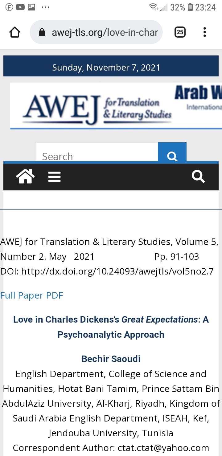 توافقاً مع رؤية المملكة 2030، وتحقيقاً لأهداف جامعة الأمير سطام بن عبد العزيز نحو إعداد جيل قادر على إتقان أدوات البحث العلمي وتطبيقها من خلال تحويل أفكار مشاريع التخرج لطالبات البكالوريوس إلى ورقة بحثية تنشر باسم الجامعة في مجلة علمية محكمة، وبرعاية رشيدة من عميدة كلية العلوم والدراسات الإنسانية بحوطة بني تميم د/ حصة بنت سعود الهزاني، تتقدم لجنة مشاريع التخرج بوحدة الخريجات بأسمى آيات التهاني والتبريكات للخريجات المميزات بقسم اللغة الإنجليزية و آدابها و اللاتي تمكن من النشر في المجلة الأمريكية العلمية المحكمة The Arab World English Journalو المصنفة في شبكة العلوم Web of Science وهن: أميرة علي البديوي، فاطمة علي العنزان، لولوه محمد السبر، و نوف محمد السماري، نورة علي التميمي عن نشر مقال بعنوان" Love in Charles Dickens's Great Expectations: A Psychoanalytic Approach" على الرابط: https://awej-tls.org/love-in-charles-dickenss-great-expectations-a-psychoanalytic-approach/