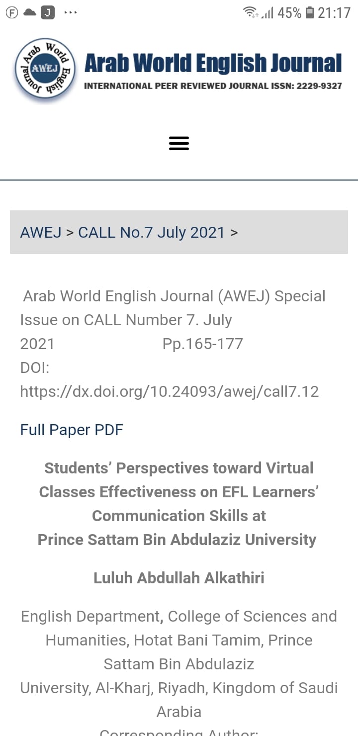 بتاريخ 5/24/2021 بإشراف سعادة الدكتور/ بشير حامد السعودي، وكذلك العنود عبد العزيز الكليب، بشاير صالح باتيس، خلود محمد عوضه، نوره راشد بن موينع عن نشر مقال بعنوان " Students’ Perspectives toward Virtual Classes Effectiveness on EFL Learners’ Communication Skills at Prince Sattam Bin Abdulaziz University” على الرابط: https://awej.org/students-perspectives-toward-virtual-classes-effectiveness-on-efl-learners-communication-skills-at-prince-sattam-bin-abdulaziz-university/