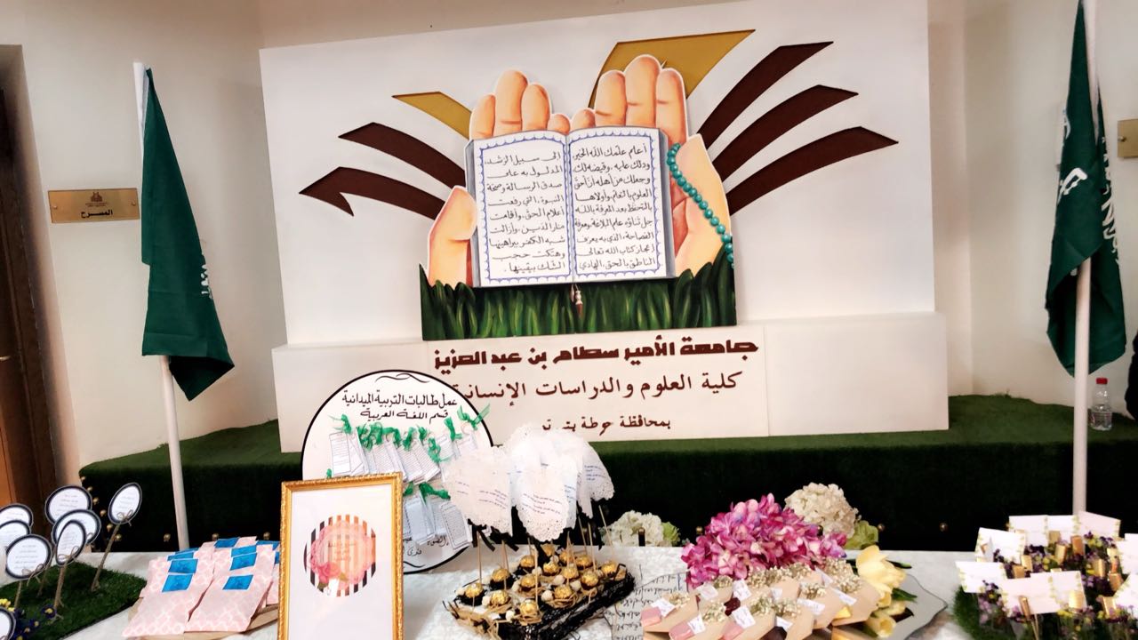 نظم قسم اللغة العربية في كلية العلوم والدراسات الإنسانية بحوطة بني تميم فعالية اليوم العالمي للغة العربية والتقنية الحديثة يوم الخميس ٢٦/٣/١٤٣٩هـ في تمام الساعة العاشرة صباحاً تحت إشراف أ. سارة القحطاني و أ. نحا القحطاني. كان هذا الاحتفاء بدعم وتوجيه سعادة عميدة الكلية الدكتورة حصة بنت سعود الهزاني، ابتدأ برنامج الحفل بآيات من الذكر الحكيم تبعها كلمة لعميدة الكلية د. حصة الهزاني ثم تلتها كلمة لرئيسة قسم اللغة العربية د. أماني عبد الرازق. كما قدمت فقرة عن القصة القصيرة وضح فيها ماهيتها وأنواعها وأثرها انتقلنا إلى مناظرة بين اللغة الفصحى واللهجات العامية لقيت استحسانا من الحضور، ومن ثم قدمت فقرة الخطوط العربية وبعدها فقرة تعليم العربية للناطقات بغيرها وشاركت د. عبير بتجربتها التطبيقية في هذا المجال. ختم البرنامج بدراسة بينية للقصيدة الرقمية.