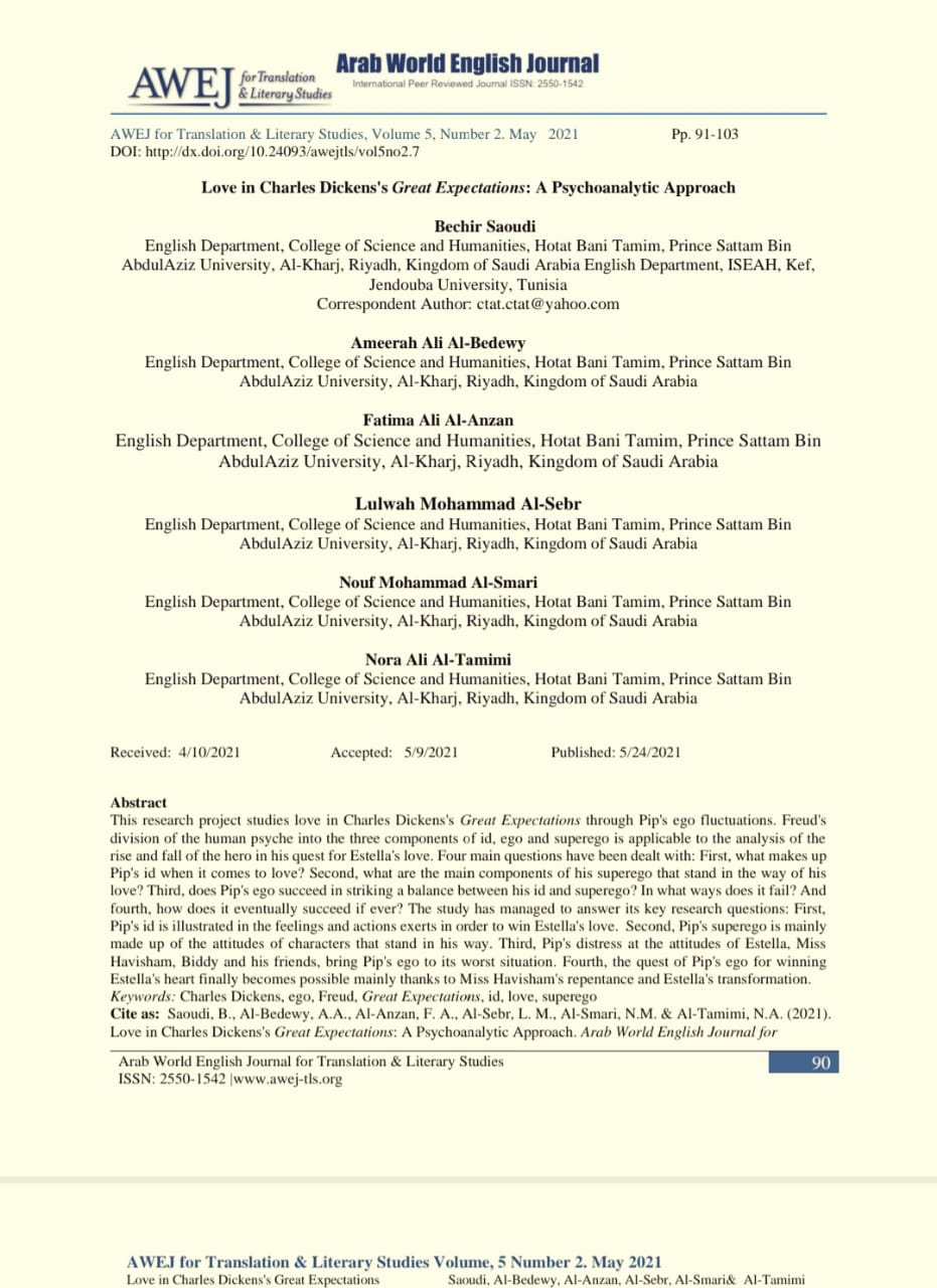تألقت طالبات قسم اللغة الإنجليزية بكلية العلوم والدراسات الإنسانية بحوطة بني تميم مرة أخرى في نشر المقال العلمي الثالث على التوالي، و يستند المقال إلى مشروع تخرج الطالبات المتألقات وهن: أميرة علي البديوي، فاطمة علي العنزان، لولوه محمد السبر، نوف محمد السماري، ونورة علي التميمي للفصل الدراسي الثاني للعام الجامعي1442هـ، تحت رعاية عميدة الكلية الدكتورة حصة بنت سعود الهزاني، وإشراف أستاذ الأدب الإنجليزي الدكتور بشير حامد السعودي، و تم نشر المقال بعنوان: Love in Charles Dickens's Great Expectations: A Psychoanalytic Approach (الحب في رواية توقعات عظيمة للكاتب الإنجليزي تشارلز ديكنز: مقاربة تحليلية نفسية)، في المجلة الأمريكية العلمية المحكمة The Arab World English Journal والمصنفة في شبكة العلوم Web of Science في المجلد الخامس، رقم 2من المجلة بتاريخ 24 مايو 2021. ويتناول المقال الرواية بالدرس معتمداً نظرية سيغموند فرويد Sigmund Freud للتحليل النفسي، حيث يبين الصراعات العاطفية الدائرة لدى بطل الرواية Pip بين رغبته في الاقتران ب Estella ومتطلبات الأنا الأعلى ومدى قدرة الأنا على تجاوزها وحلها.