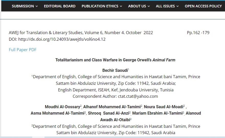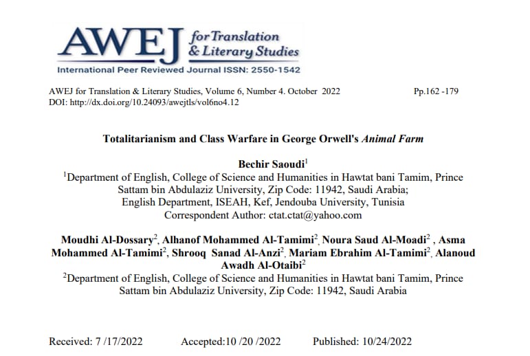 والذي يتناول بالنقد والتحليل قضية الصراع الطبقي المهيمن على معظم جوانب الحياة الواقعية، وذلك تحت إشراف سعادة د/ بشير حامد السعودي أستاذ الأدب الإنجليزي بقسم اللغة الإنجليزية فله من الشكر أجزله ومن الثناء أوفره على دعمه للطالبات وتذليل كافة العقبات حتى توج الإنجاز بنشر المقال بالمجلد السادس، رقم 4 (24 أكتوبر 2022).