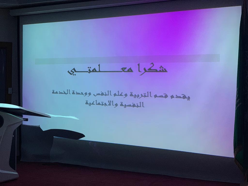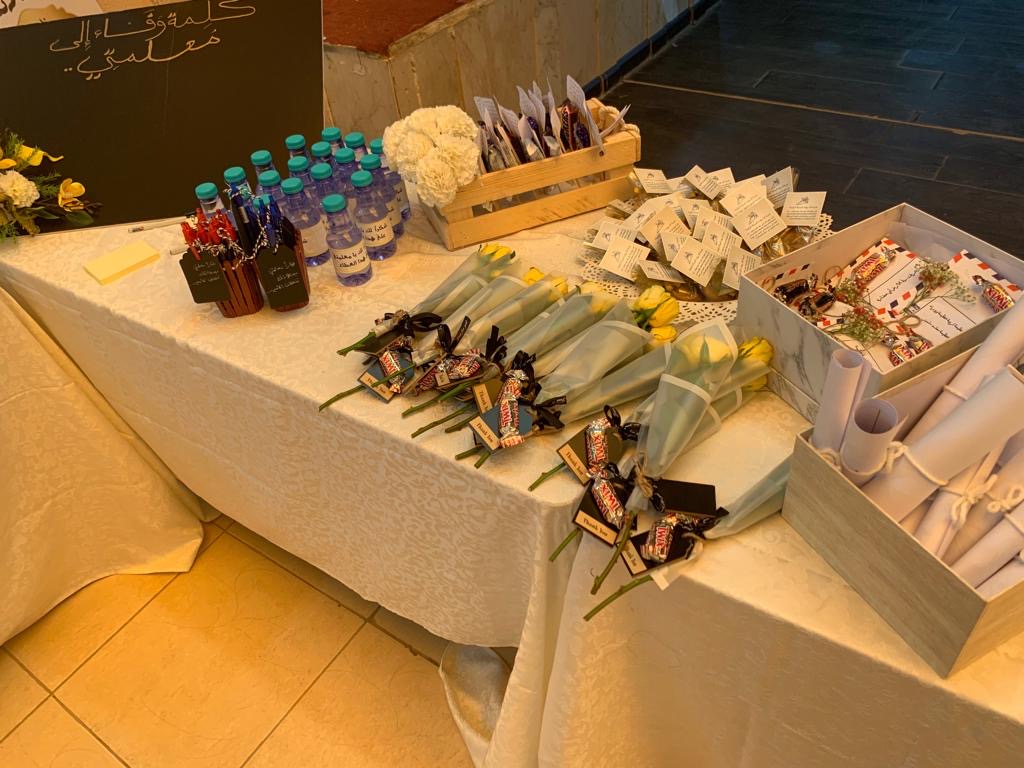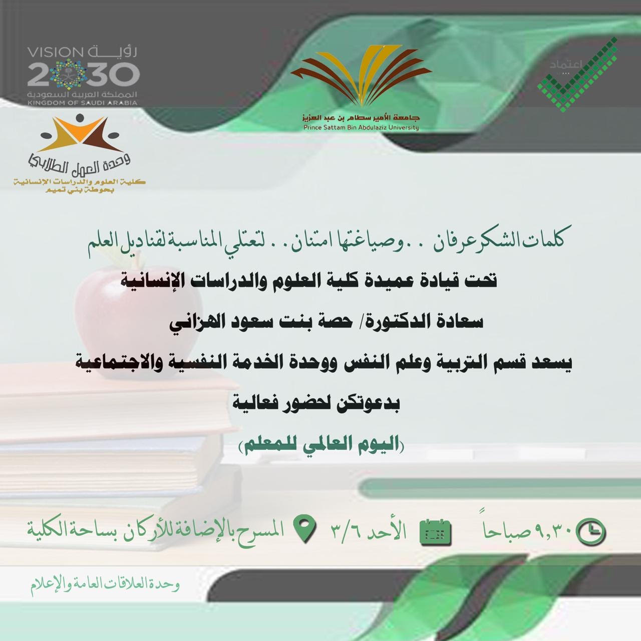 من الفضل ألا ننسى أصحاب الفضل، فكيف بمن أفنى عمره للعلم والتعليم، ومن هنا حرصت قيادة عميدة كلية العلوم والدراسات الإنسانية بحوطة بني تميم د. حصة بنت سعود الهزاني على المشاركة في فعالية "اليوم العالمي للمعلم" ، فقدمها قسم التربية وعلم النفس بالتعاون مع وحدة الخدمة النفسية والاجتماعية يوم الأحد الموافق: ١٤٤١/٣/٦هـ في تمام الساعة ١٠:٣٠ صباحًا في بهو الكلية ومسرحها. دارت محاور الفعالية حول تكريم صاحب العطاء وحامل مهنة التعليم المعلم المعطاء، فبدأ البرنامج بآيات من القرآن الكريم، ثم تلتها كلمات شكر وإجلال لهم، وأعقبت بأبيات من الشعر للمعلمة المتميزة صاحبة الفضل، وأثناء البرنامج استضيفت قائدة مدرسة المتوسطة والثانوية بتحفيظ حوطة بني تميم المعلمة والقائدة الكريمة: عائشة الدابان وتم تكريمها، كما رافق البرنامج أركانا في بهو الكلية تحمل شعار شكرٍ وتقديرٍ للمعلمة، ولقي استحسانا وأثرًا في نفوس الحضور.