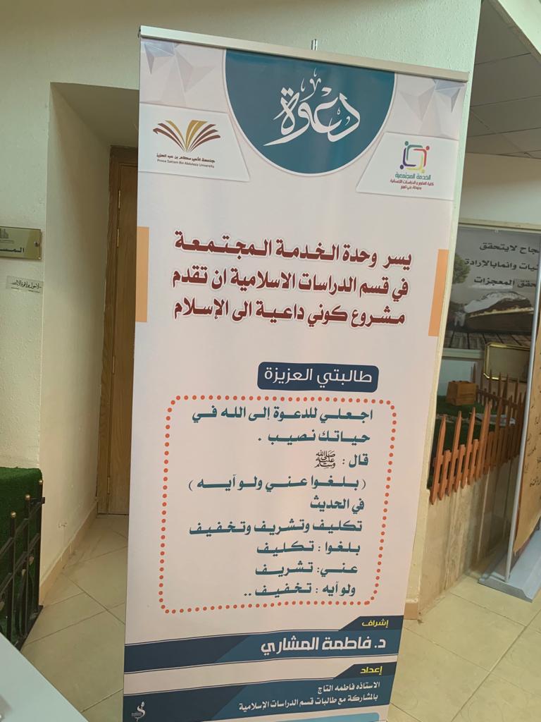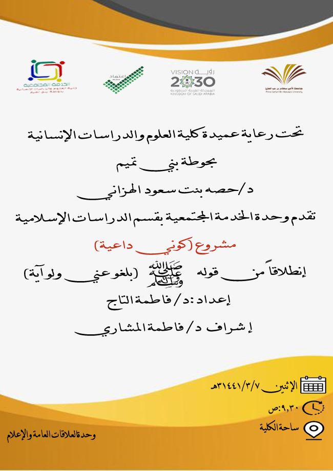 "الدين النصيحة" من هذا المنطلق و تحت قيادة عميدة كلية العلوم والدراسات الإنسانية بحوطة بني تميم سعادة الدكتورة/ حصة بنت سعود الهزاني، أقامت وحدة الخدمة المجتمعية بقسم الدراسات الإسلامية مشروع "كوني داعية" واستنادًا لقوله ﷺ ( بَلِّغُوا عَنِّي ولو آيَة) وذلك في يوم الأثنين الموافق: ١٤٤١/٣/٧ هـ في تمام الساعة التاسعة و النصف صباحًا في بهو الكلية. هدف المشروع إلى نشر ثقافة الدعوة إلى الله، والأمر بالمعروف والنهي عن المنكر، إضافة إلى رفع مستوى وعي الطالبات بأهمية المشاركة في خدمة المجتمع، وتنمية مهارات الطالبات في التواصل مع الآخرين وتقديم النصيحة لهم، شهد المشروع حضوراً وتفاعلًا من جميع منسوبات الكلية .
