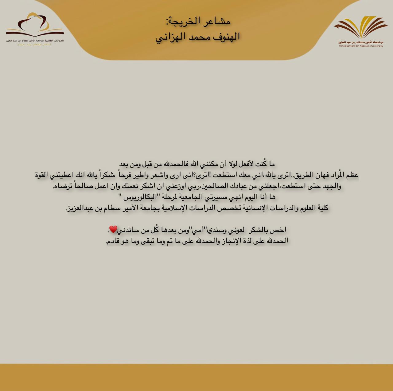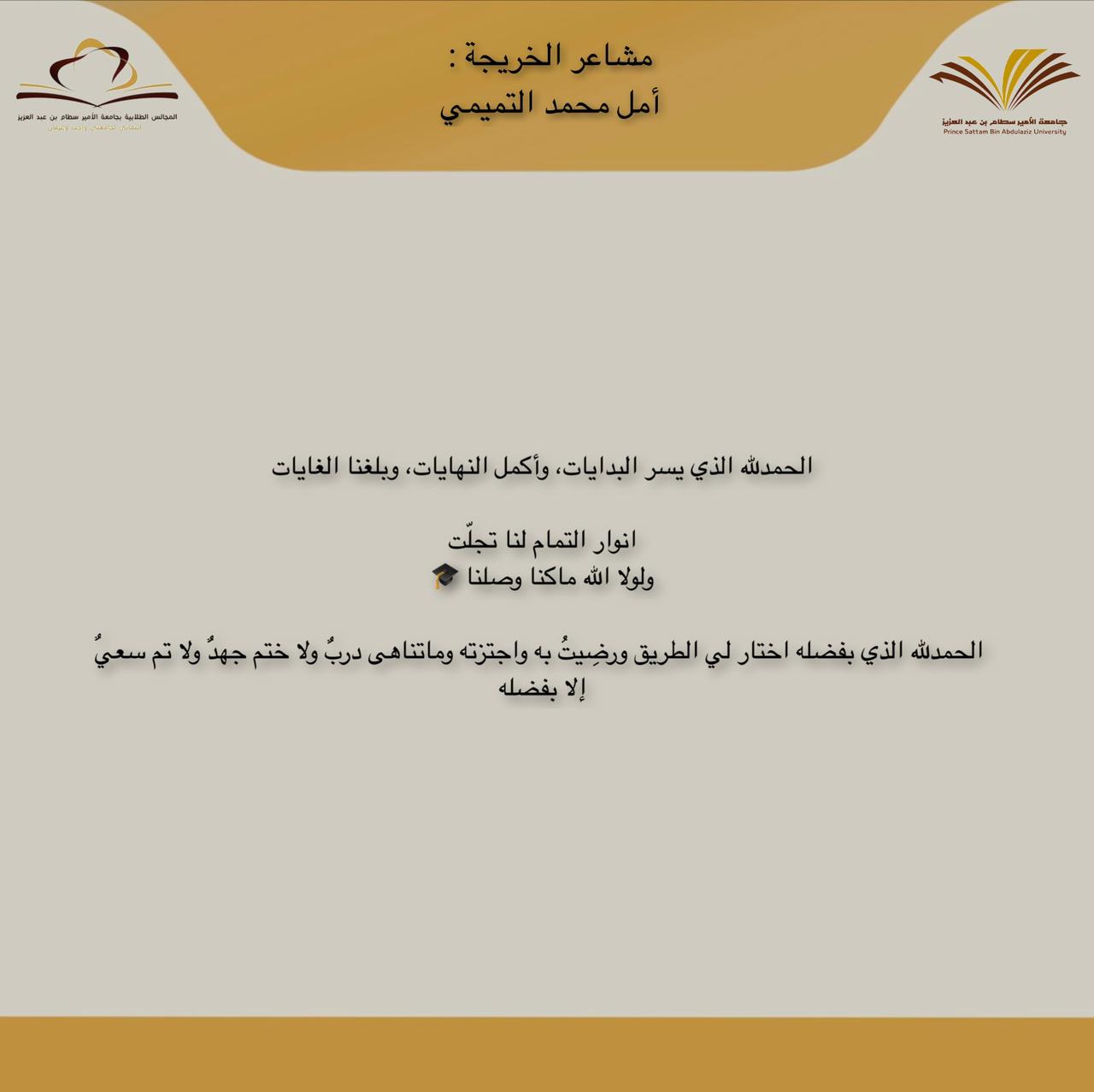 هنيئاً لطالباتنا هذا الإنجاز وهنيئاً لهن حصاد الثمر وحصول المبتغى، والشكر الأوفى والثناء الأجزل لعميدتنا الفاضلة لمشاركتها طالباتنا الخريجات والشكر موصول لأعضاء الهيئة التعليمية الذين أخلصوا النية وأحسنوا العمل وأجزلوا العطاء فأثمرت جهودهم الموفقة نبتاً طيباً تمثل في هذه الكوكبة من الخريجات في مختلف مجالات العلم والمعرفة.