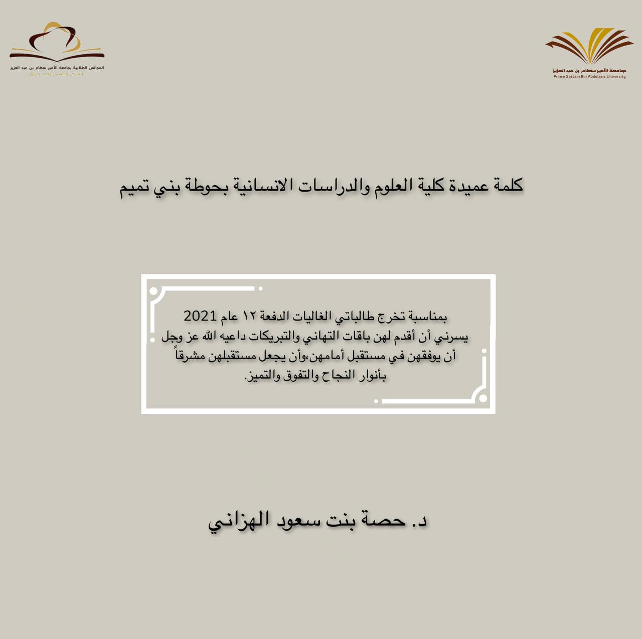 يبقى التخرج هو الذكرى الجميلة في حياة الإنسان، والتي يظل يتذكرها طوال حياته، لذا يبحث عن أعذب الكلمات عن التخرج ليسجل بها تلك الذكرى، وذلك من خلال مشاركة من المجلس الاستشاري الطلابي لطالباتنا خريجات الدفعة (١٢) تحت رعاية عميدة كلية العلوم والدراسات الإنسانية بحوطة بني تميم د. حصه بنت سعود الهزاني، وبإشراف منسقة المجلس أ. منيره إبراهيم التميمي.