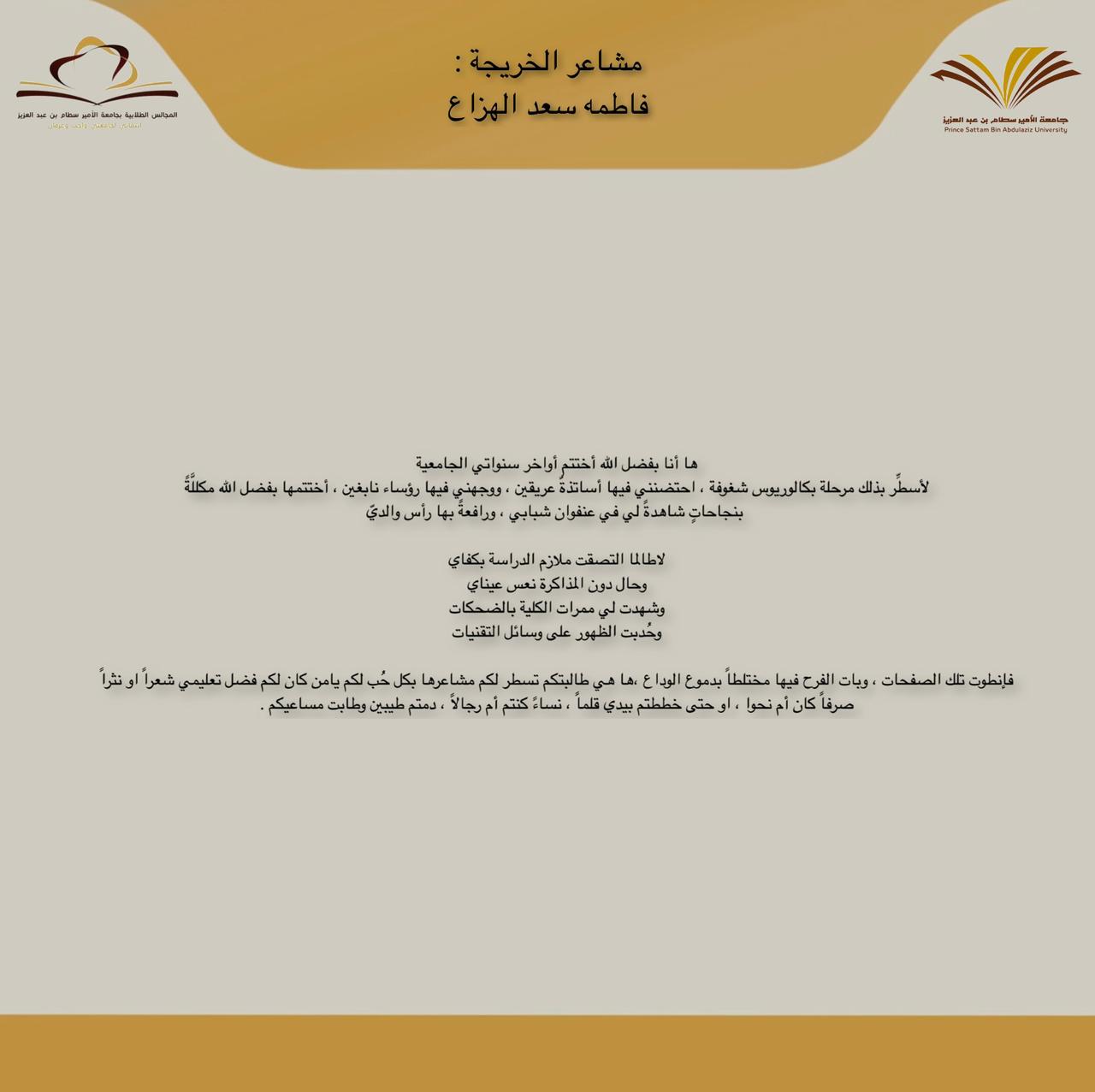 تم استقبال مشاركات الخريجات من مختلف الأقسام من يوم الأربعاء الموافق: ١١/ ٨/ ١٤٤٢هـ عبر حساب المجلس بتويتر بعنوان (مشاعر خريجة) وتم عمل مونتاج لهذه المشاركات يوم الاثنين الموافق: ٣٠ /٨/ ١٤٤٢هـ بهدف مشاركة الطالبات الخريجات مشاعرهن بالتخرج.