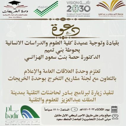 في إطار تفعيل الزيارات الميدانية للمؤسسات الرائدة في مجال دعم مشاريع الأعمال المبنية على التقنية، و في ظل قيادة عميدة كلية العلوم و الدراسات الإنسانية بحوطة بني تميم د. حصة بنت سعود الهزاني. نفذت لجنة مشاريع التخرج بوحدة الخريجات بالتعاون مع وحدة العلاقات العامة والإعلام زيارة لبرنامج بادر لحاضنات التقنية بمدينة الملك عبد العزيز للعلوم و التقنية أحد أهم البيئات الوطنية في مجال دعم تأسيس و نمو مشاريع التقنية و تحويلها إلى فرص تجارية ناجحة. بدأت الزيارة باستقبال الطالبات - و عددهم (14) طالبة بقسم نظم المعلومات - بموقع الحاضنة بمدينة الرياض اليوم الثلاثاء الموافق: 1441/2/23هـ. حيث تم التعريف ببرنامج بادر لحاضنات و مسرعات التقنية، و ما يشمله من شروط الاحتضان، و الخدمات المالية و المحاسبية و القانونية و الاستشارات المقدمة للمشاريع المحتضنة. إضافة إلى التعريف بمكتب بادر لخدمات المخترعين السعوديين و ما يقدمه من استشارات و توجيه للمخترع بما يتماشى مع متطلبات مكتب البراءات السعودي، فضلاً عن إقامة برامج تدريبية و حلقات نقاش و ورش عمل لإثراء المعرفة في مجال الملكية الفكرية، و كيفية التسجيل في تلك الفعاليات من خلال برنامج بادر لايف. و اختتمت الزيارة بعرض بعض قصص النجاح لخريجي برنامج بادر و الإجابة على أسئلة و استفسارات الطالبات.