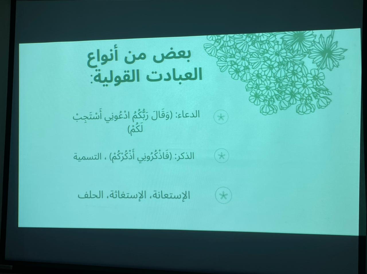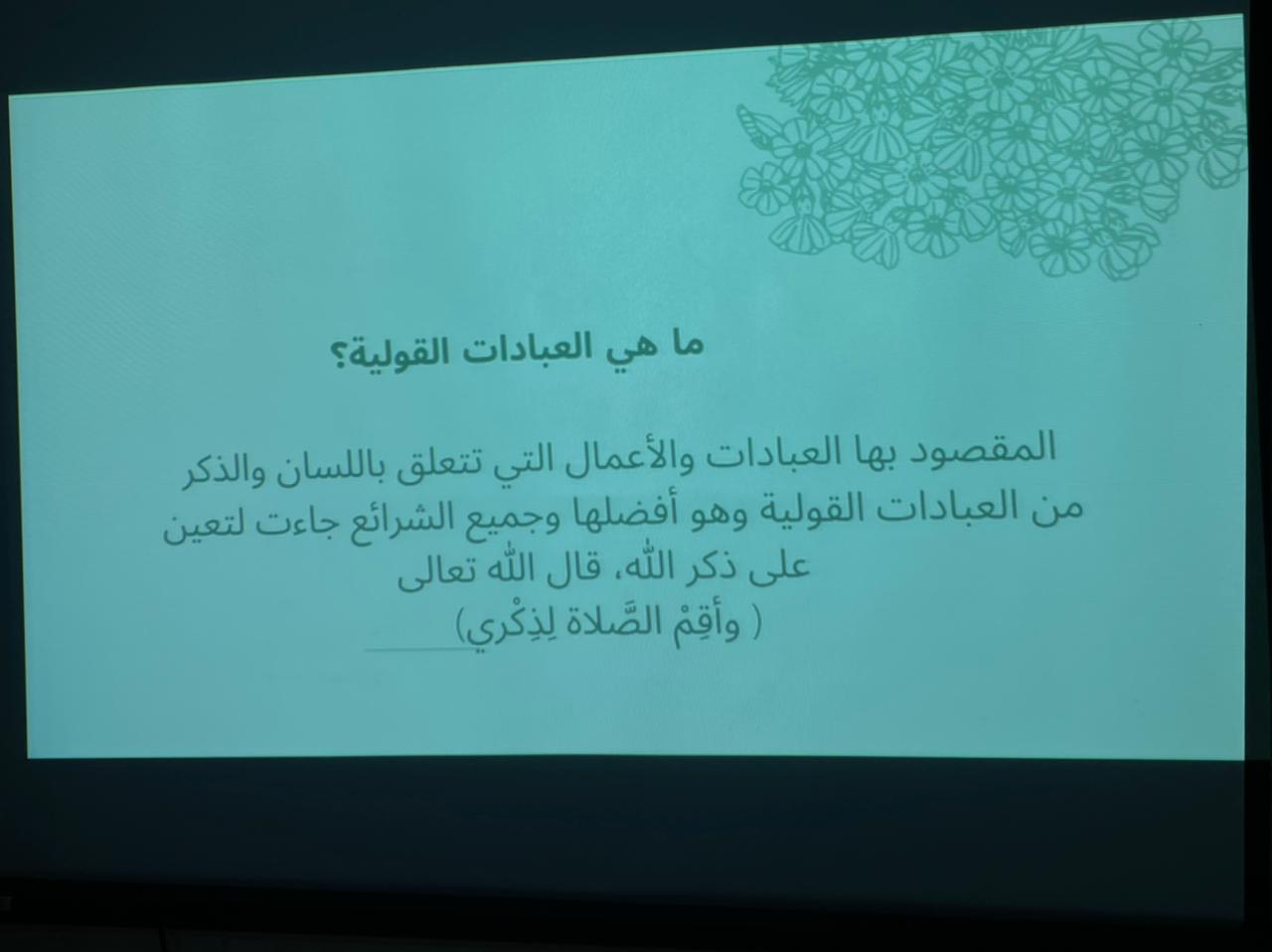 وضح البرنامج أنواع العبادات فهناك عبادات فعلية وقولية معاً كالصلاة، وعبادات فعلية فقط كالزكاة، وعبادات قولية فقط كالأذكار، وبين معنى العبادات القولية وهي العبادات التي تتعلق باللسان والذكر وذكر بعضاً من أنواع العبادات القولية مثل (الاستغفار -التسمية -الاستعانة) وبين فضل الأذكار واهميتها، وفي الختام شكرت مديرة القسم ا/ فوزية الجمعة د. نادية وطالباتها على البرنامج المميز ورحبت بأي فكرة لديهن فالجمعية ترحب بالجميع.