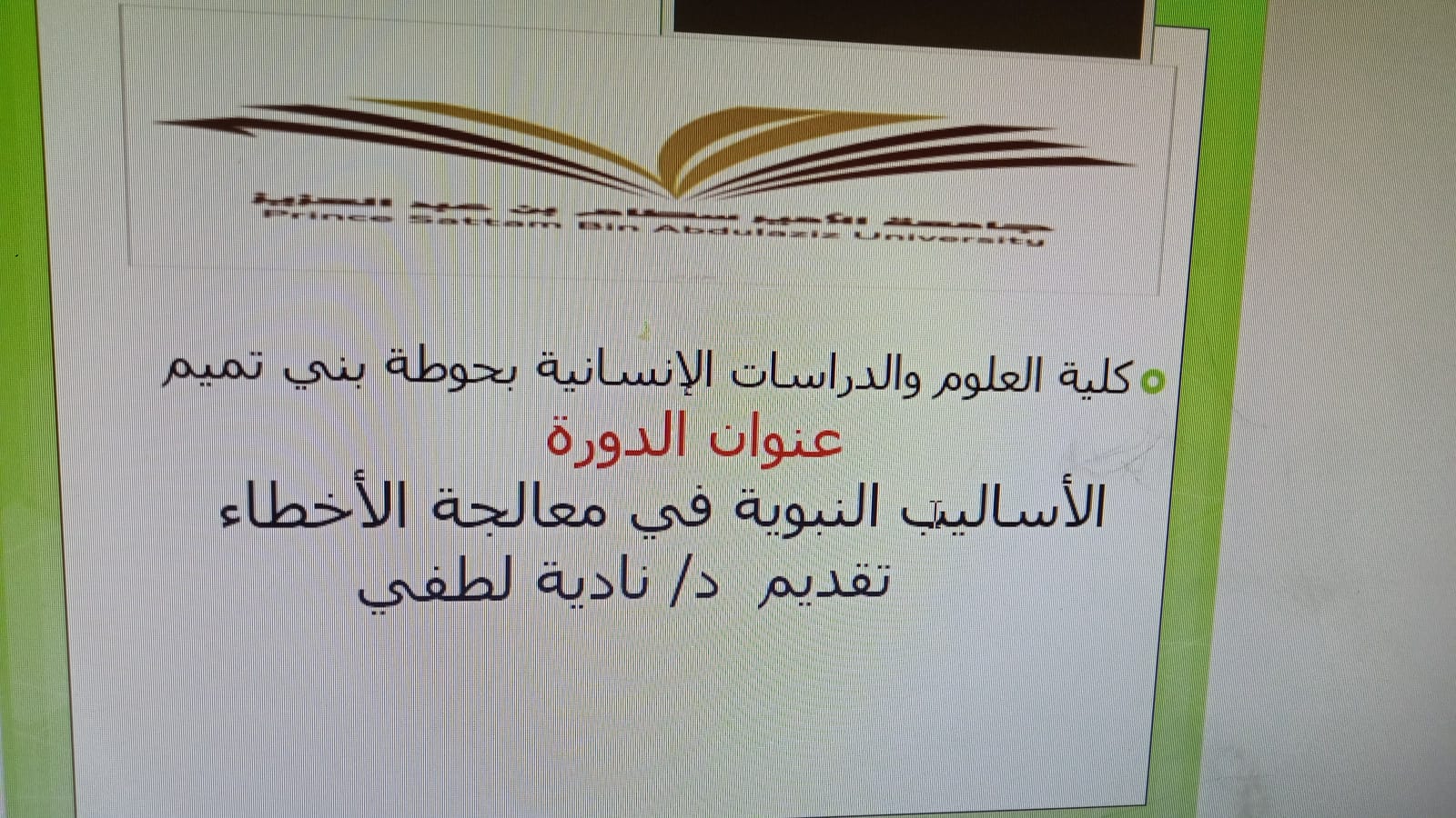 إن اتباع المنهج النبوي وأساليبه فيه الاتساء بالنبي - صلى الله عليه وسلم، حيث نظمت وحدة الخدمة المجتمعية بكلية العلوم والدراسات الإنسانية تحت رعاية سعادة عميدة الكلية الدكتورة / حصة بنت سعود الهزاني، دورة تدريبية بعنوان (الأساليب النبوية في معالجة الأخطاء) بجمعية الدعوة والإرشاد بمحافظة حوطة بني تميم في يوم الخميس الموافق: 1443/3/8هـ تقديم د. نادية لطفي، وكان الهدف من الدورة إكساب المشاركات المعارف والمهارات اللازمة في معالجة الأخطاء وفقاً لأساليب النبي صلى الله عليه وسلم، وبينت أولاً معنى الخطأ لغة واصطلاحاً ، وأنه صفة ملازمة لبني آدم إلا من عصمه الله، وأسباب وقوع الخطأ وأقسامه وأنواعه والخطوات التي اتخذها القرآن الكريم لعلاج الأخطاء العقائدية والتعبدية والاجتماعية والسياسية العسكرية مع ذكر نماذج من أخطاء المؤمنين في العهد النبوي والآثار المترتبة على ترك علاج الأخطاء ، والآثار الإيجابية لمعالجة الأخطاء والوسائل القرآنية الوقائية من الوقوع في الأخطاء.