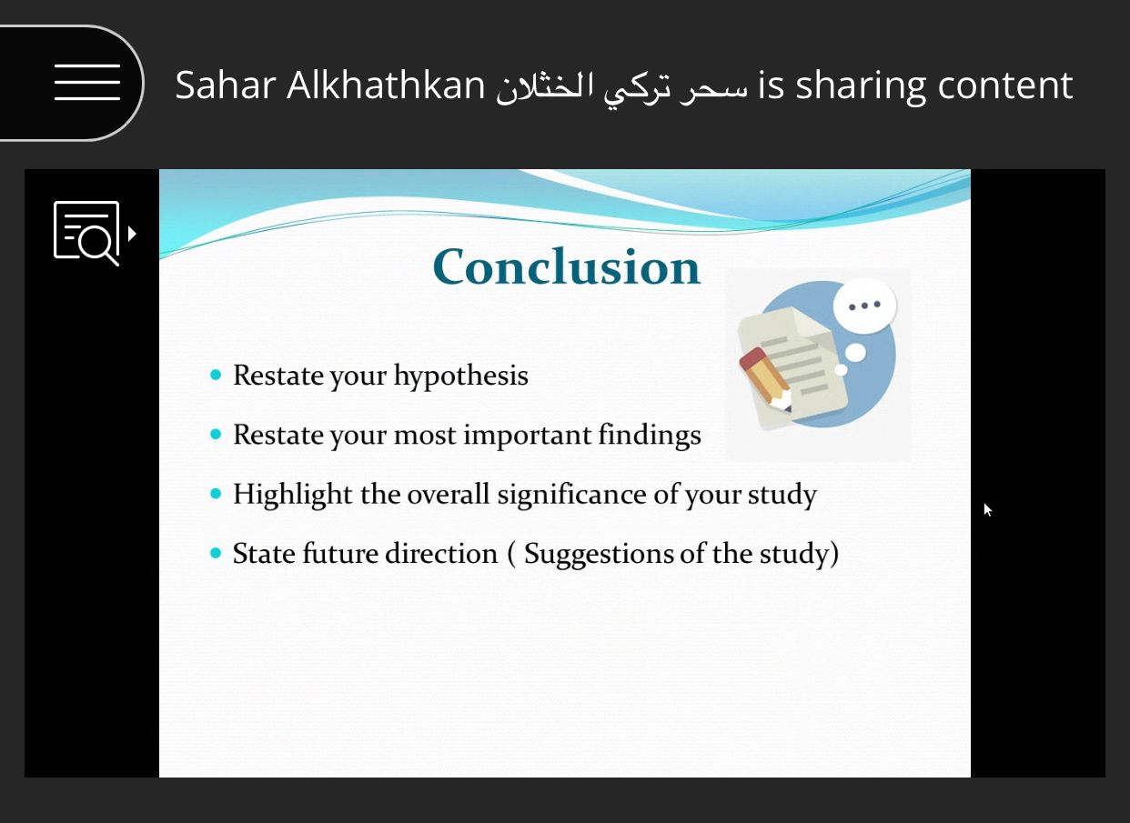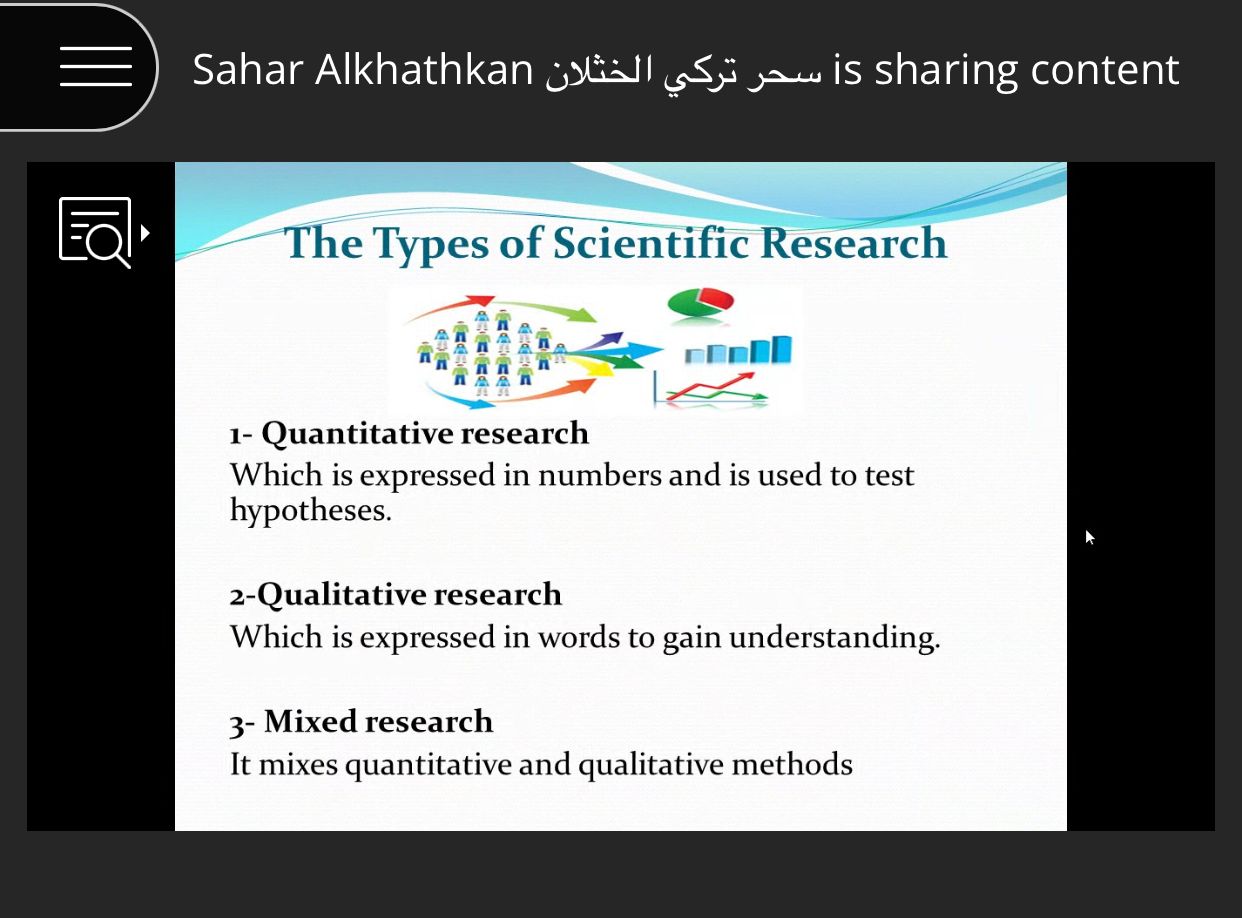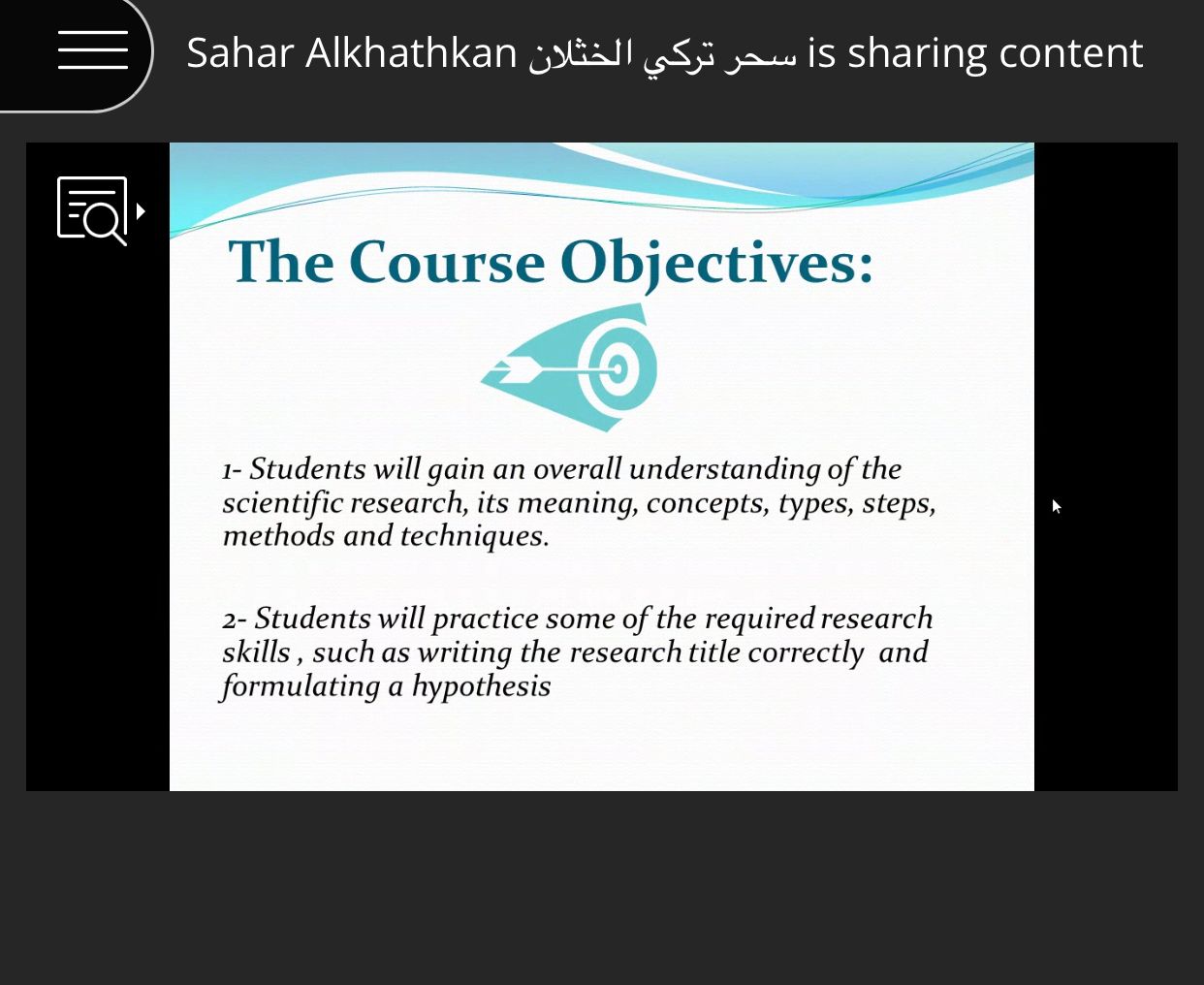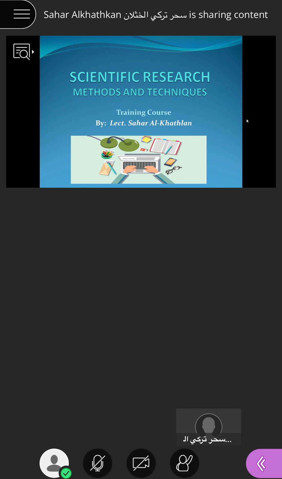 ومن تلك الأهمية ينبثق حرصنا على تمكين الطالب من تلك المهارة استيعاباً وتطبيقاً ليتمكن من استغلالها في نتاج حقيقي دائم. تحت رعاية عميدة كلية العلوم والدراسات الإنسانية بحوطة بني تميم د. حصة بنت سعود الهزاني نظمت لجنة مشاريع التخرج التابعة لوحدة الخريجات دورة تدريبية بعنوان (طرق وآليات البحث العلمي) تحت إشراف المحاضر بقسم اللغة الإنجليزية أ. سحر الخثلان وذلك يوم الأربعاء تاريخ 1444/6/11هـ الموافق 2023/1/4 الساعة السابعة مساءً على موقع البلاك بورد. وبحضور طالبات من مختلف مستويات قسم اللغة الإنجليزية بالإضافة للطالبات المتوقع تخرجهن.
