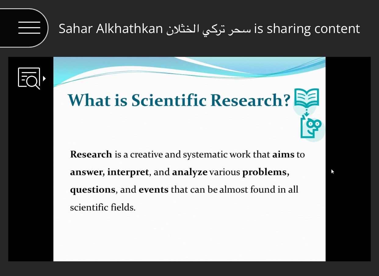 بدأت الدورة بالتعريف العام بمفهوم البحث العلمي وطرقه وأنواعه وأجزاءه وخطواته وشروط إتقانه ومن ثم التعمق في استعراض بعض الاستراتيجيات والتقنيات التي تساهم في تنظيم وتسهيل عملية البحث، وقد تخلل ذلك تطبيقات عملية لبعض الأجزاء المهمة في البحث العلمي ككتابة العنوان وصياغة الفرضية.