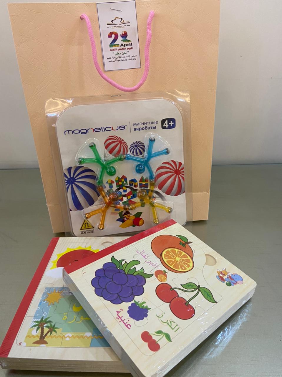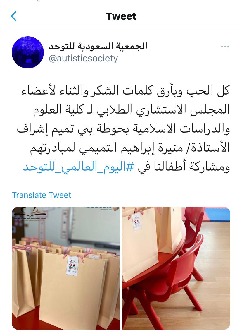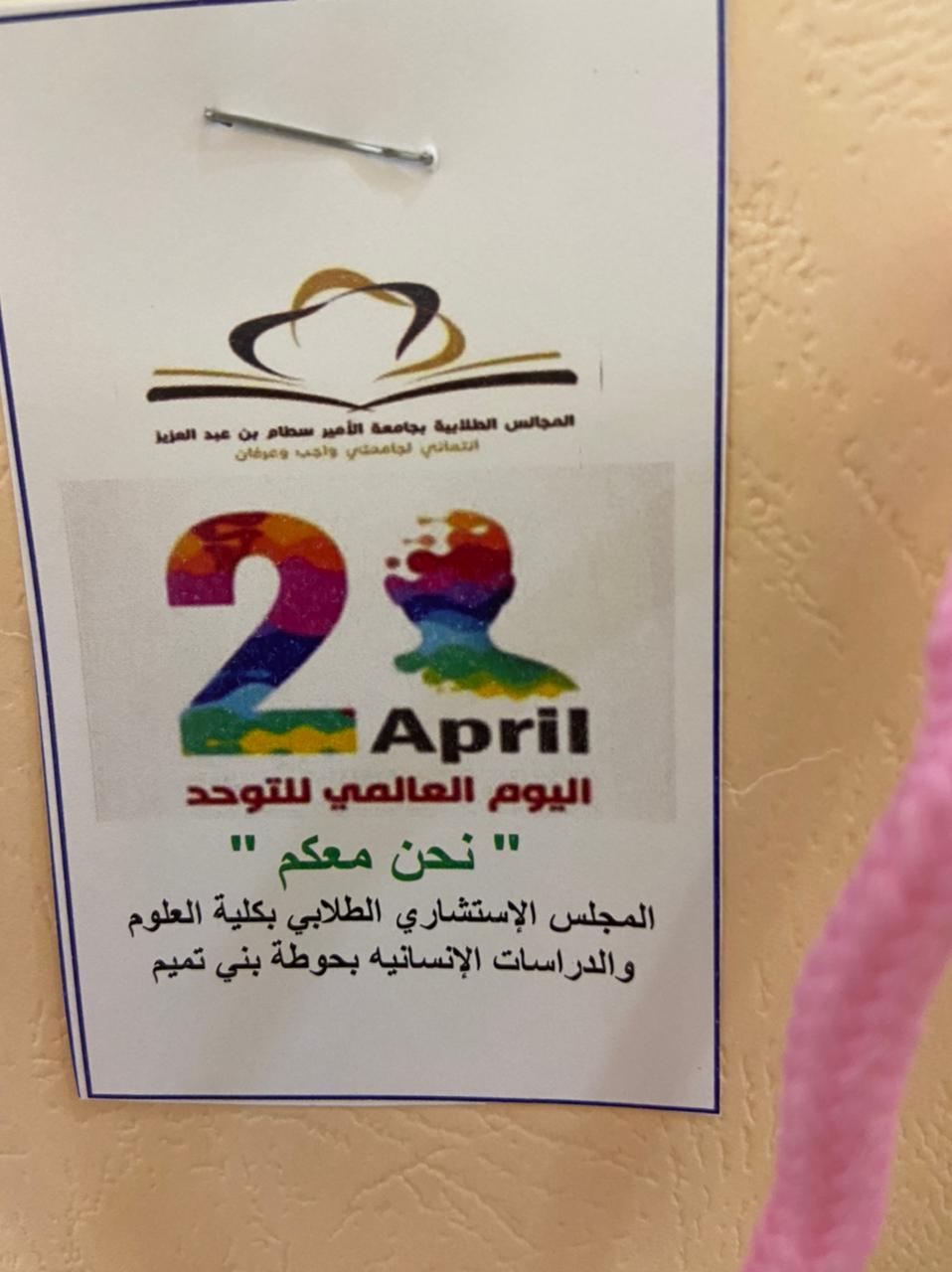 يصادف اليوم الثاني من إبريل اليوم العالمي للتوحد، ويهدف هذا اليوم إلى التعريف بهذا المرض وزيادة التوعية به ،وانطلاقاً من رسالة الجامعة 2030 وإيماناً منها بالدور الإيجابي لتعزيز الشراكة والمسؤولية الاجتماعية، وتحت رعاية عميدة كلية العلوم والدراسات الإنسانية بحوطة بني تميم د. حصه بنت سعود الهزاني، نظم المجلس الاستشاري الطلابي لقسم الكيمياء بإشراف منسقة المجلس للقسم أ. منيره إبراهيم التميمي اليوم الأحد الموافق: ٢٢/ ٨/ ١٤٤٢هـ مبادرة لهذه الفئه بإرسال الهدايا لهم بمركز الأمير ناصر بن عبدالعزيز للتوحد بالرياض إيماناً منا بحقوقهم علينا من أجل رسم الابتسامة على وجوههم ونشر الفرحة والبهجة في نفوسهم، كما قدمت جمعية أسر التوحد الشكر لكلية العلوم والدراسات الإنسانية بحوطة بني تميم ممثلة بالمجلس الاستشاري الطلابي على هذه المبادرة لأطفال التوحد.