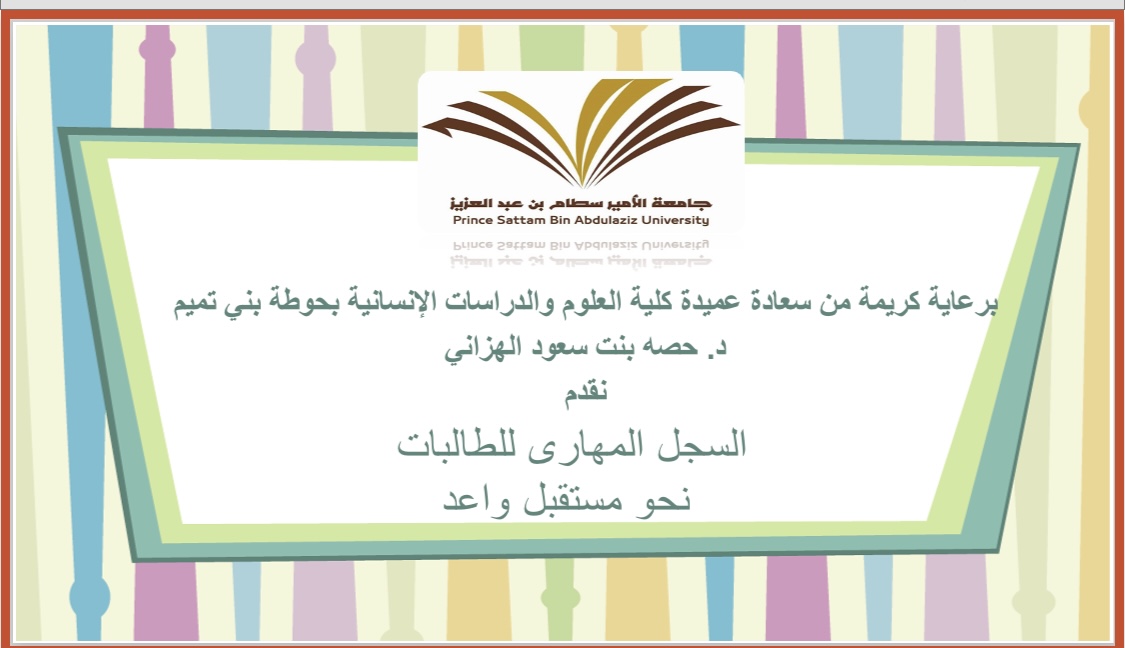 تسعى جامعة الأمير سطام بن عبد العزيز إلى تزويد الطلاب والطالبات بوثيقة رسمية توضح المهارات المهنية والشخصية المكتسبة خلال مرحلة الدراسة الجامعية، ومن هذا المنطلق وتحت رعاية عميدة كلية العلوم والدراسات الإنسانية بحوطة بني تميم د/ حصة بنت سعود الهزاني قدم قسم الكيمياء برنامج تعريفي بعنوان" السجل المهاري للطالبات" من تقديم د/ مي مصطفى حسن رئيسة قسم الكيمياء وذلك في يوم الثلاثاء الموافق: 1443/2/7هـ الساعة 10 صباحاً بمسرح الكلية.
