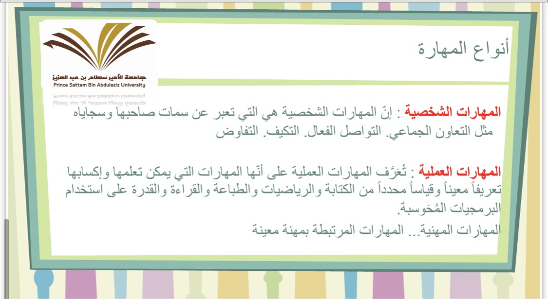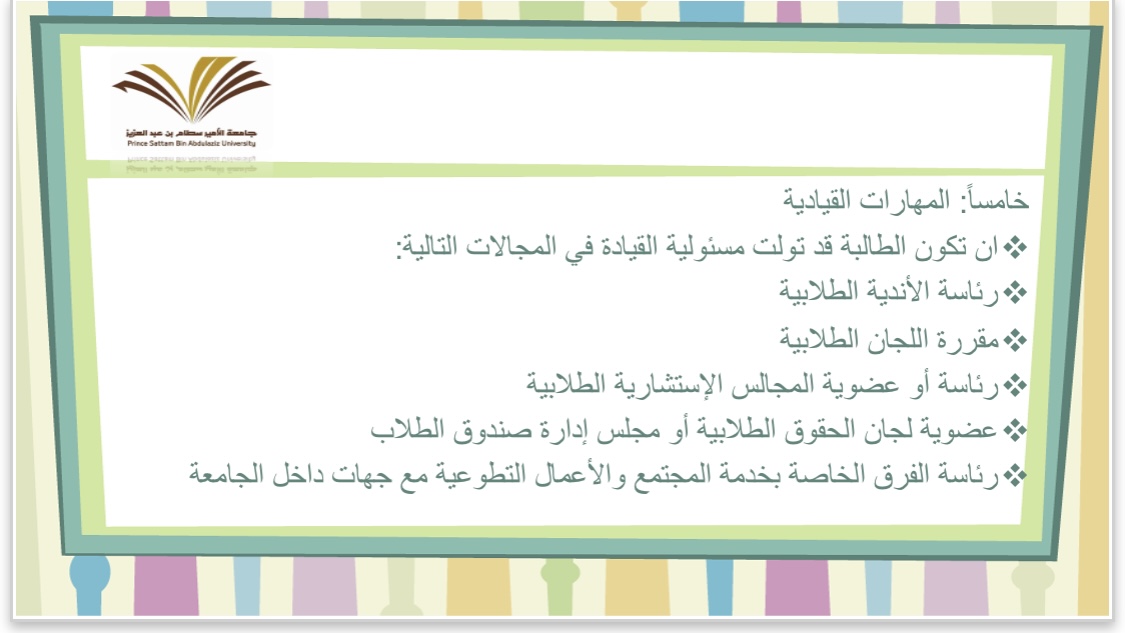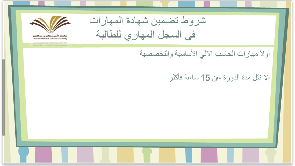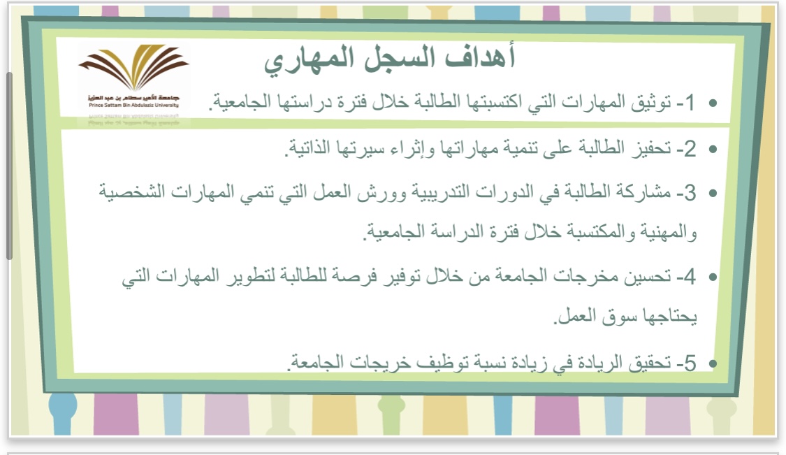 كما أنها تطرقت إلى كيفية الحصول على السجل المهاري والدورات المعتمدة، وآلية الدخول وتسجيل المهارات والدورات فيه، وقد حضر البرنامج عدد من رؤساء الأقسام ومشرفات الانشطة والنوادي بالكلية.