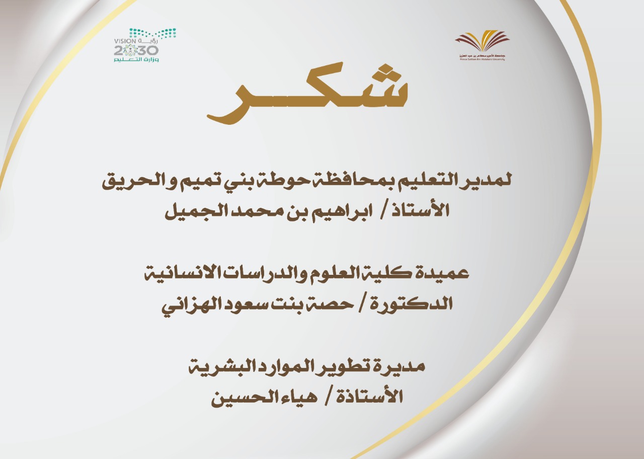 وفي ختام الدورة، قدمت المدربة /فوزية جمعة شكرها إلى عميدة الكلية الدكتورة/ حصة بنت سعود الهزاني، ومدير التعليم في المحافظة الأستاذ/ إبراهيم بن محمد الجميل، ومديرة تطوير الموارد البشرية في إدارة التعليم الأستاذة هياء آل حسين. وقد تكللت الدورة بالنجاح والتميز والابداع.