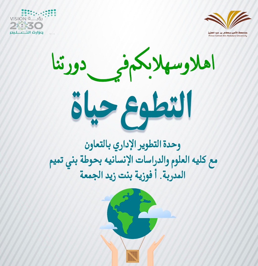 انطلاقاً من مبدأ التعاون المشترك بين إدارة التعليم بمحافظتي حوطة بني تميم والحريق وكلية العلوم والدراسات الإنسانية بحوطة بني تميم ورغبتهما في تحقيق المزيد من التعاون والتنسيق والتكامل بينهما في جميع المجالات التي تخدم بيئة العمل انطلقت دورة بعنوان "التطوع حياة " قدمتها الإدارية في الكلية المدربة أ. فوزية بنت زيد بن جمعة وبمشاركة أ. أسماء بنت فوزان المبارك مستشار تصميم البرامج التربوية من يوم الأحد الموافق: 1443/4/9هـ لمدة ثلاثة أيام بواقع 12 ساعة.