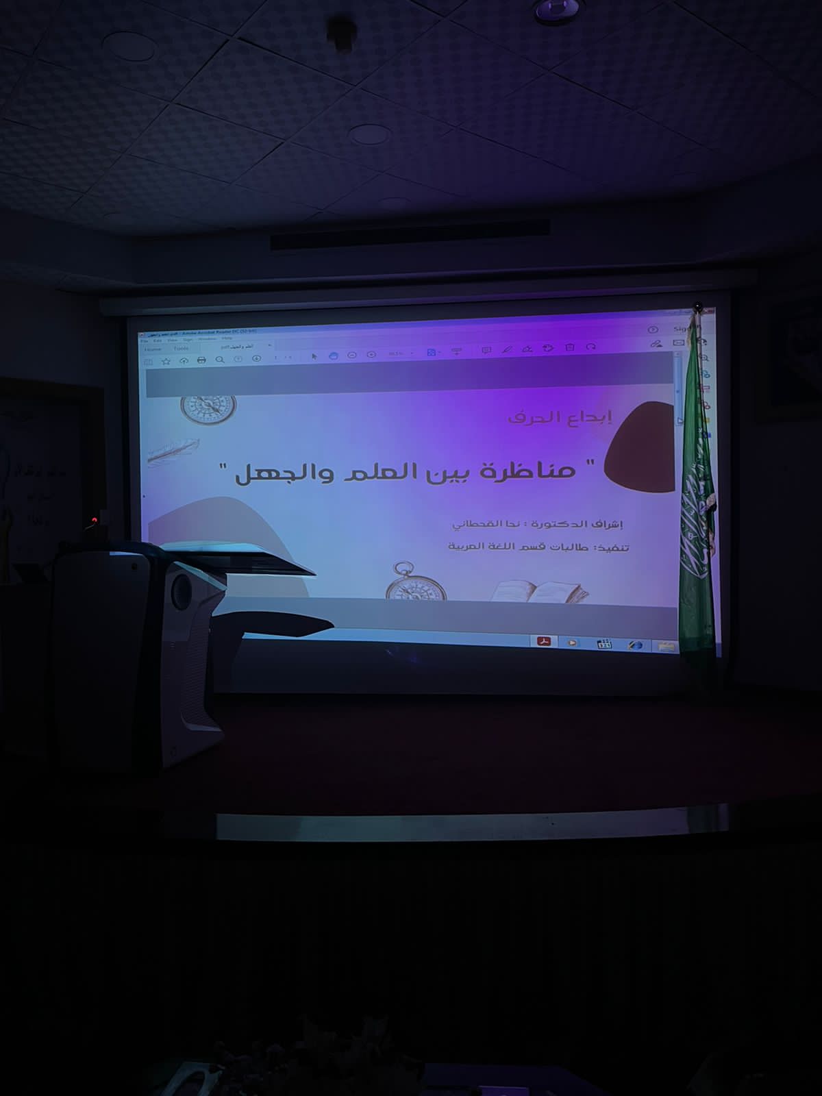 عندما يحتدم الصراع بين العلم والجهل تتجلى الغلبة في أبهى صورها مع راية العلم، برعاية كريمة من عميدة كلية العلوم والدراسات الإنسانية بحوطة بني تميم سعادة الدكتورة حصة بنت سعود الهزاني أقام قسم اللغة العربية بإشراف الدكتورة نحا القحطاني برنامج إبداع الحرف (مناظرة بين العلم والجهل) في يوم الأربعاء الموافق ١٥/ ٧/ ١٤٤٣هـ في تمام التاسعة والنصف صباحًا بمسرح الكلية، وبحضور عدد من أعضاء هيئة التدريس والطالبات حيث جرت المناظرة على لسان عدد من طالبات القسم اللاتي مثلن دور العلم والجهل وذكرن ما تميز به العلم على الجهل بلغة فصيحة أبرزت جمال اللغة وبراعة العلم وحفظه للعقل وتميزه على الجهل بصورة بليغة أخذت النفوس معها وحلقت بها في سماء الإبداع، الذي آثار الحاضرات و في الوقت ذاته بينت عقدة الجهل وهبوطه بالإنسان في محاورة جميلة تبهج النفس.
