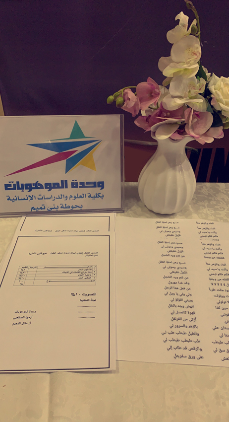 وتبقى المواهب رمزاً لإشعال الهمم لتوقد القيم، حيث أقامت وحدة الموهوبات تحت رعاية عميدة كلية العلوم والدراسات الإنسانية بحوطة بني تميم سعادة الدكتورة/ حصة بنت سعود الهزاني برنامج التحدي الثالث بعنوان (تحدي أبيات صوت صفير البلبل) بإشراف ا. مها الصقعبي و ا. منال الدحيم في يوم الأحد الموافق: ١٤٤٣/٧/١٩هـ بمسرح الكلية بتمام الساعة ١٠:٣٠صباحًا. عدد المشاركات (٣) طالبات، كما تتكون لجنة التحكيم من سعادة الدكتورة/ بيان إبراهيم السيف وكيلة الشؤون التعليمية والأكاديمية، والدكتورة/ ناديه الأمين رئيسة وحدة التسجيل وشؤون الطالبات.