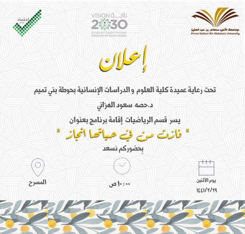لم يعد يقتصر دور المرأة على الدراسة فحسب بل أنها وصلت إلى الاكتشافات و الاختراعات التي تقدم خدمات للبشرية لا يمكن الاستغناء عنها حتى هذا الوقت، ومن هذا المنطلق وتحت قيادة عميدة كلية العلوم والدراسات الإنسانية بحوطة بني تميم د. حصة بنت سعود الهزاني. قدم قسم الرياضيات برنامج بعنوان:( فازت من في حياتها إنجاز ) تحت اشراف أ. منيرة التميمي وكان ذلك يوم الاثنين الموافق : ١٤٤١/٢/٢٩ هـ. وتدور محاور البرنامج حول تميز المرأة المنجزة في نفسها وانعكاس تميزها على المجتمع. كما تم عرض بعض النماذج من إنجازات المرأة حول العالم. وكما تم ايضًا توزيع عبارات تحفيزية للحضور لِنشر التفاؤل وعلوّ الهمّة.