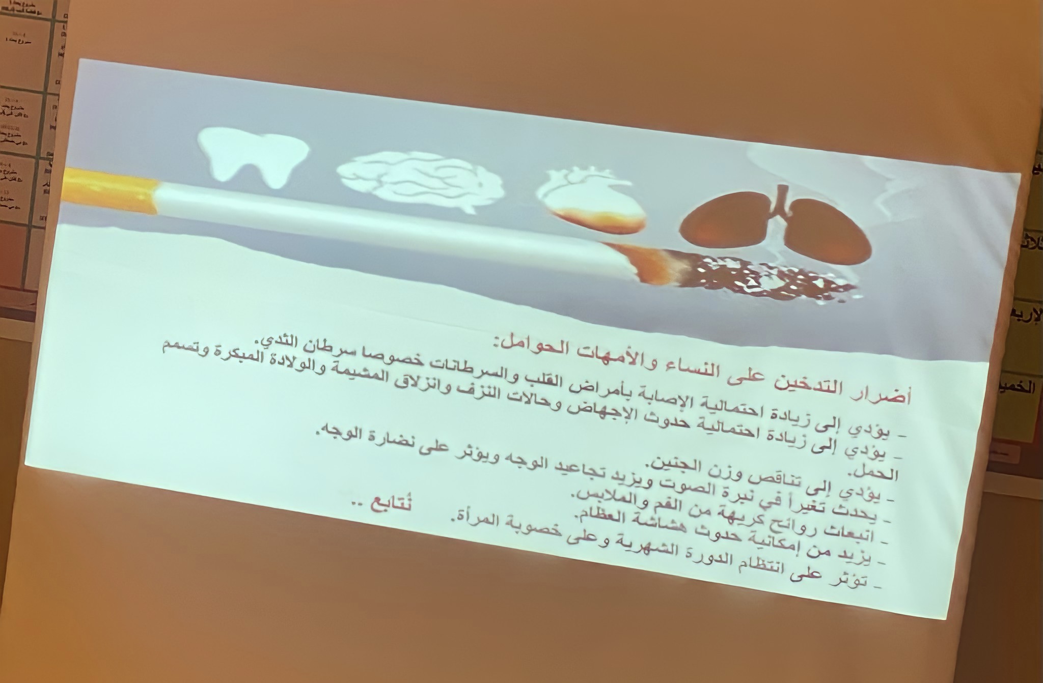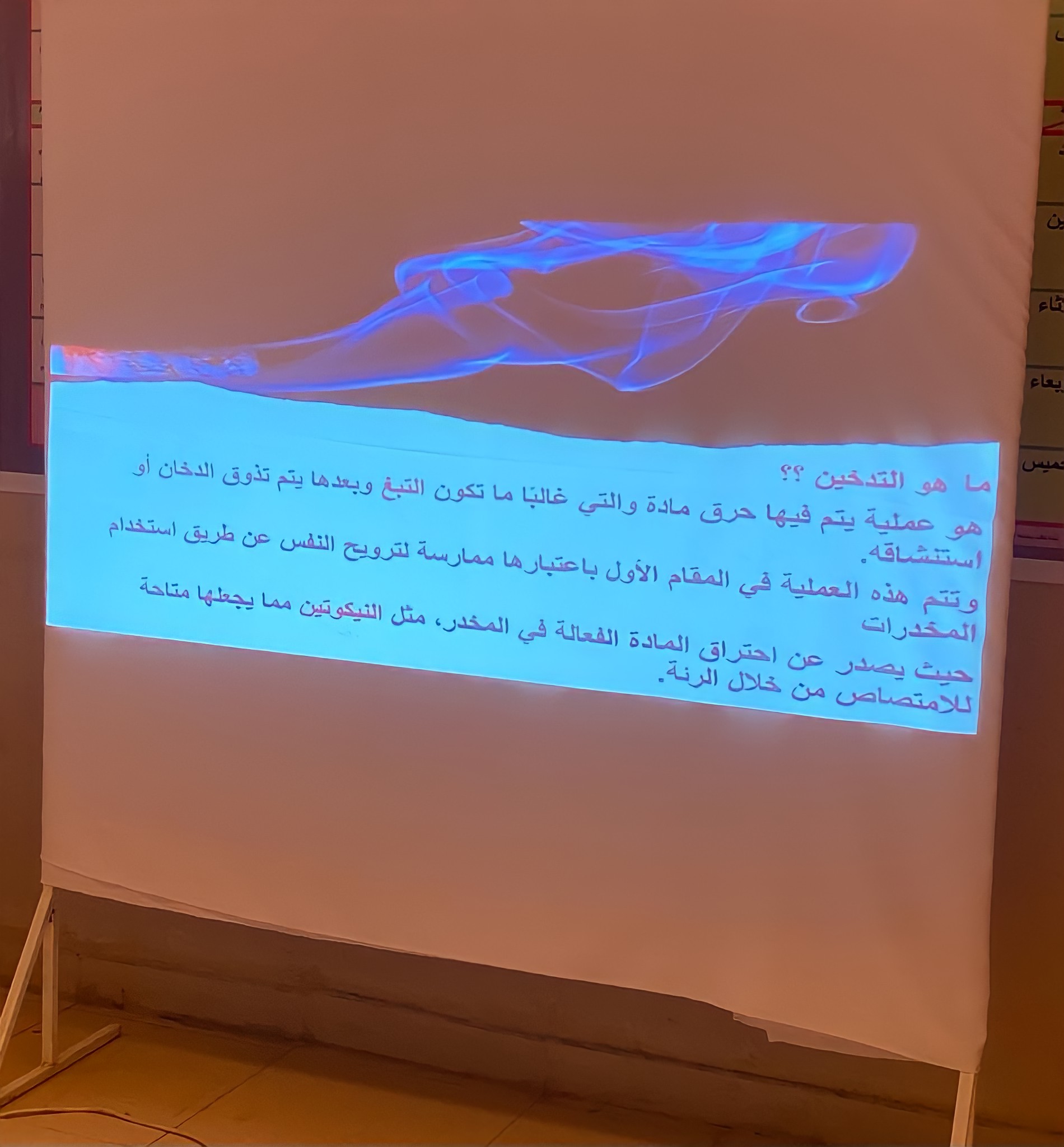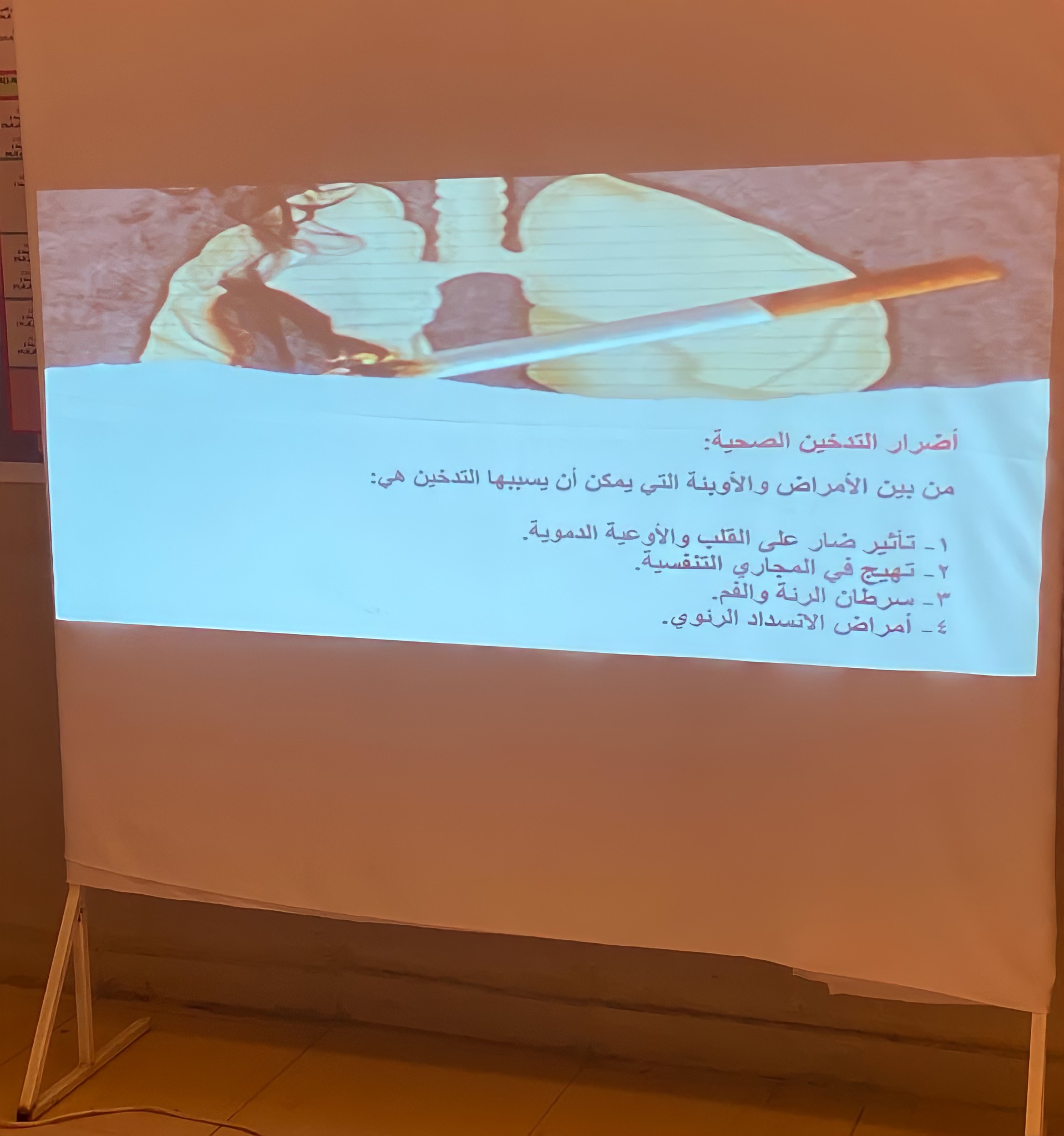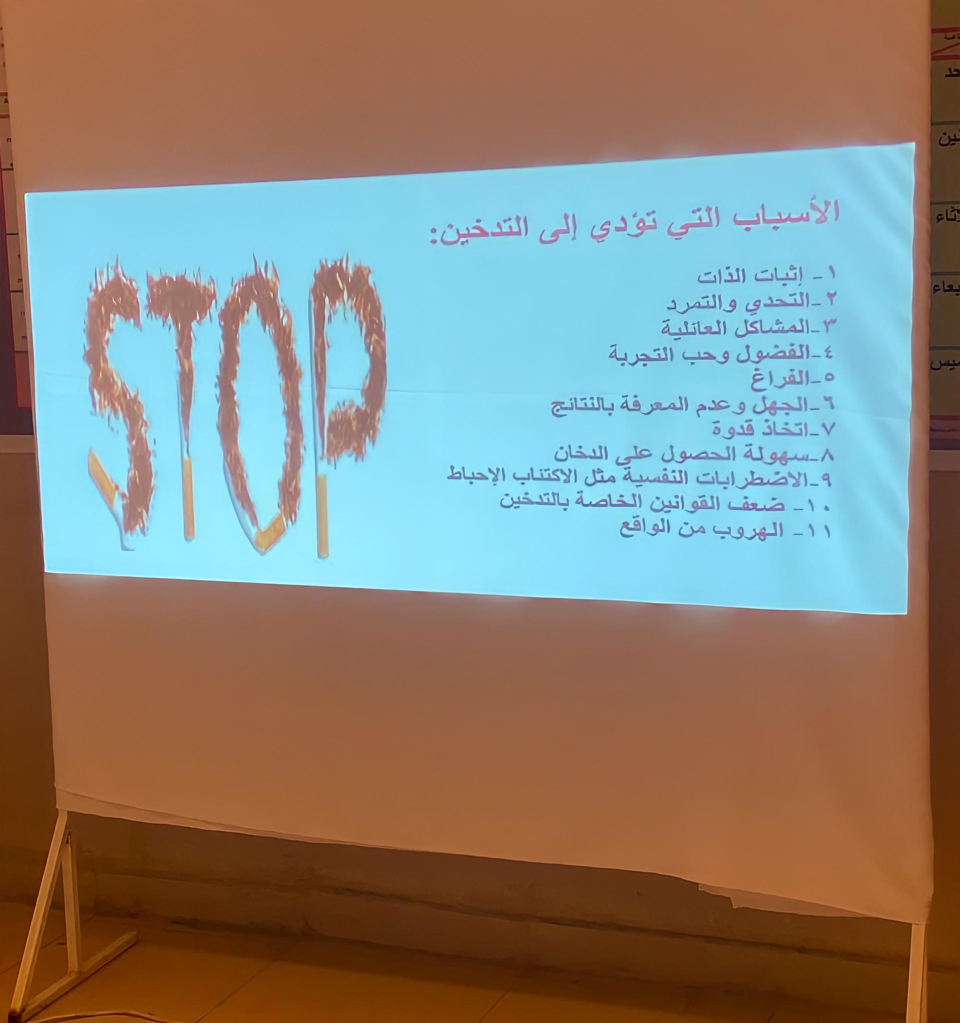 تعتبر ظاهرة التدخين من الظواهر التي انتشرت في معظم دول العالم وخاصة دول العالم الثالث، ومكافحة هذه الظاهرة من الموضوعات التي تهم المجتمعات كلها، ولأهمية ذلك، وتحت رعاية عميدة كلية العلوم والدراسات الإنسانية بحوطة بني تميم د. حصة بنت سعود الهزاني قدمت لجنة مكافحة التدخين بالجامعة والخدمة المجتمعية بالتعاون مع لجنة العمل المشترك مع المديرية العامة لمكافحة المخدرات في الجوانب التوعوية والتدريبية برنامج تثقيفي بعنوان: "التوعية من أضرار التدخين" تحت إشراف أ. ريم الحضيف وأ. نادية لطفي وذلك يوم الثلاثاء الموافق ١٤٤٣/٧/٢٨ هـ الساعة ٩:٣٠ صباحًا بساحة الكلية، وهدف هذا البرنامج إلى توعية أفراد المجتمع من طالبات ومنسوبات الجامعة بمعرفة ما هو التدخين وماهي أضراره وخطورته من خلال برنامج تقديمي يُعرف بالتدخين وأضراره وما يسببه من أمراض، واحتوى الركن على توزيعات بالإضافة إلى ركن خارج بوابة الكلية.