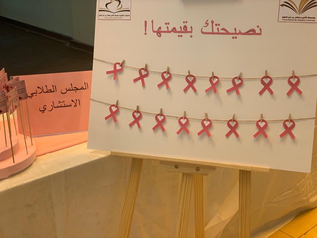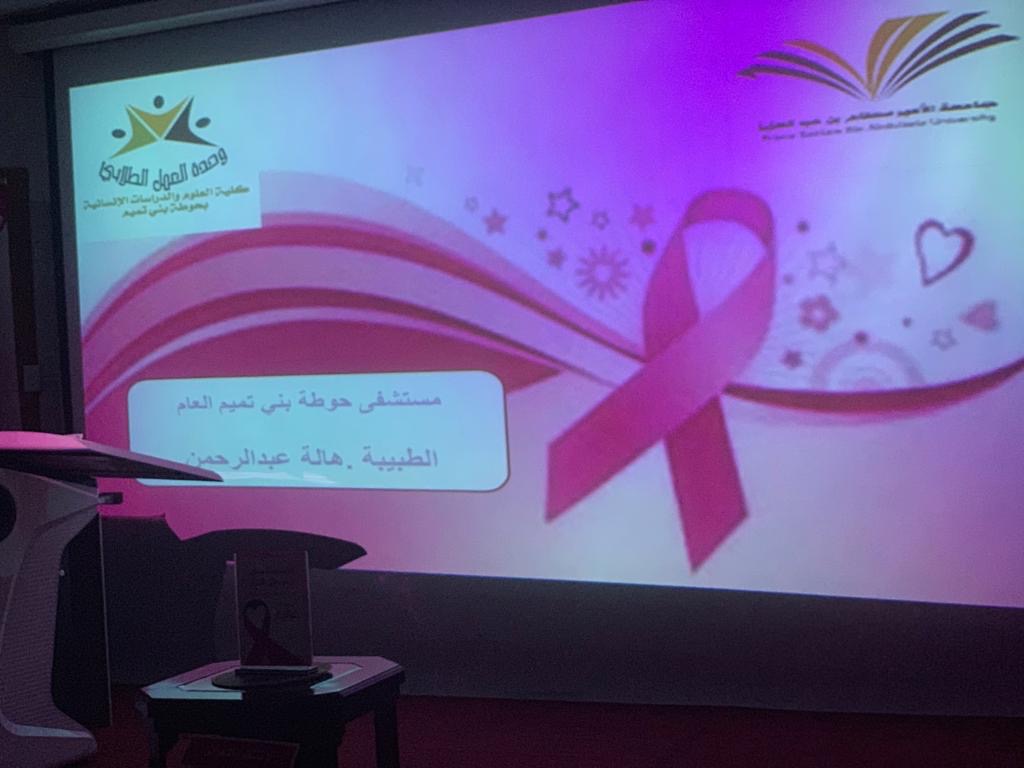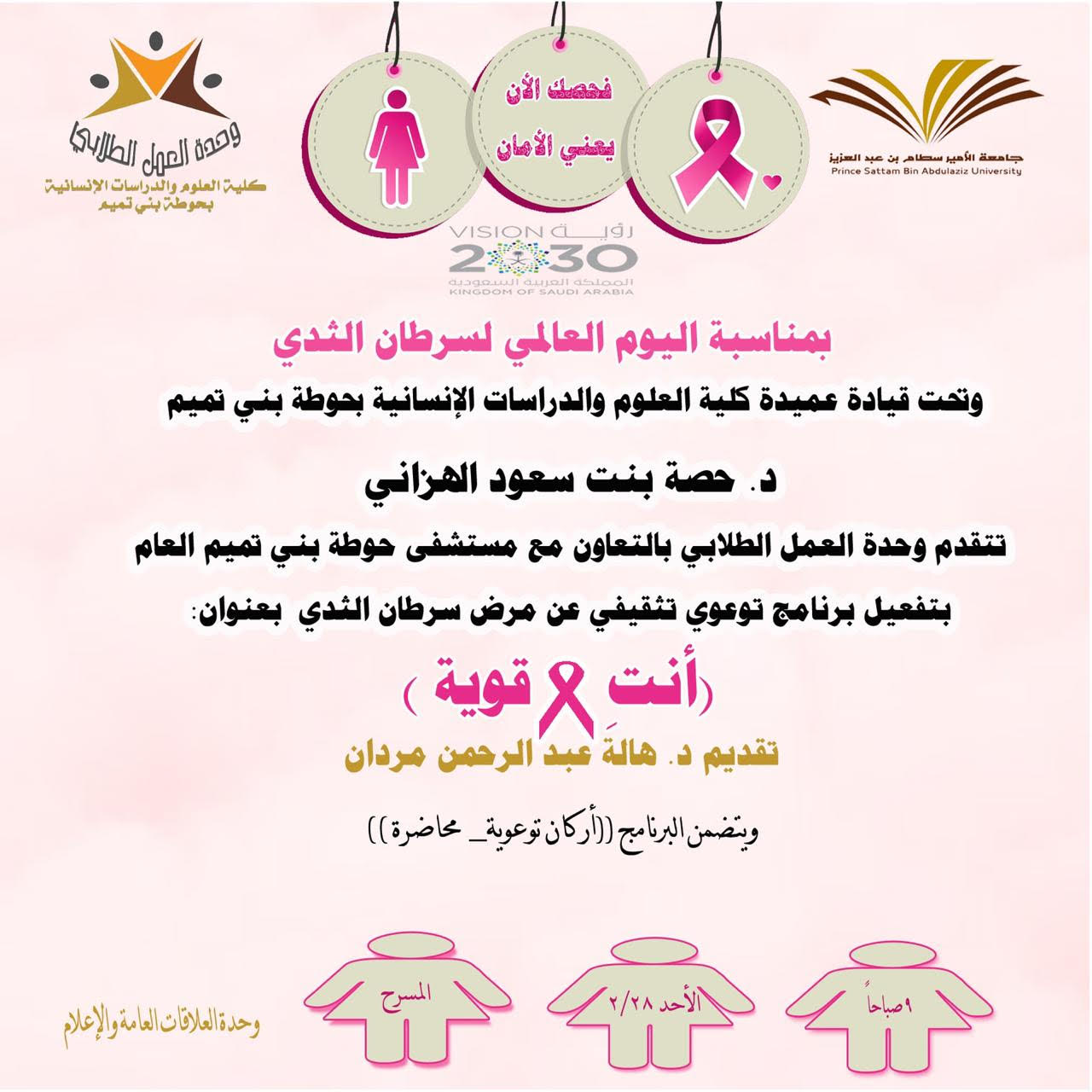 مساندة من د. حصة بنت سعود الهزاني عميدة كلية العلوم والدراسات الإنسانية بحوطة بني تميم لليوم العالمي لسرطان الثدي وتحت شعار "أنتِ قوية" قدمت وحدة العمل الطلابي بالتعاون مع مستشفى حوطة بني تميم العام، بحضور الطبيبة : هالة عبدالرحمن مردان، والطبيبة : ساجدة بدر الدين يوسف، وعدد من الممرضات، برنامجاً توعوياً بالتعاون مع الأقسام والأندية والوحدات والمجالس الطلابية بالكلية، وذلك يوم الأحد الموافق: 1441/2/28هـ ، حيث تمحور البرنامج على عدد من الفقرات بدأ بمقدمة ترحيبية للحضور، عقبتها آيات من القرآن الكريم عن الشفاء، ثم تلتها مشاركة قسم اللغة الإنجليزية "بفيديو لمحاربات سرطان الثدي"، كما أُدرجت فيديوهات توعوية مقدمة من وزارة الصحة، وتلاها فقرة الطبيبة : هالة ، تمحورت حول مفهوم السرطان بشكل عام وسرطان الثدي بشكل خاص، والتحدث عن أعراضه وكيفية الكشف عنه وعوامل الإصابة بالمرض. هدف البرنامج إلى تقديم رسالة توعوية للوقاية من المرض، وأهمية الفحص المبكر، وشروط الفحص المجاني. ثم عقبتها فقرة لمُحارِبة سرطان، إذ عرضت تجربتها وكيفية تغلبت على المرض بعون من الله، كما شارك قسم اللغة العربية بفيديوهات توعوية. وخُتم البرنامج بمسابقة تنافسية حول المعلومات المقدمة، ومن ثم على جوائز قيّمة، كما كُرّمت الطبيبة والممرضات بشهادة شكر وتقدير على ما بذلوه من توعية للحضور، ولقي البرنامج تفاعلا من جميع منسوبات الكلية.