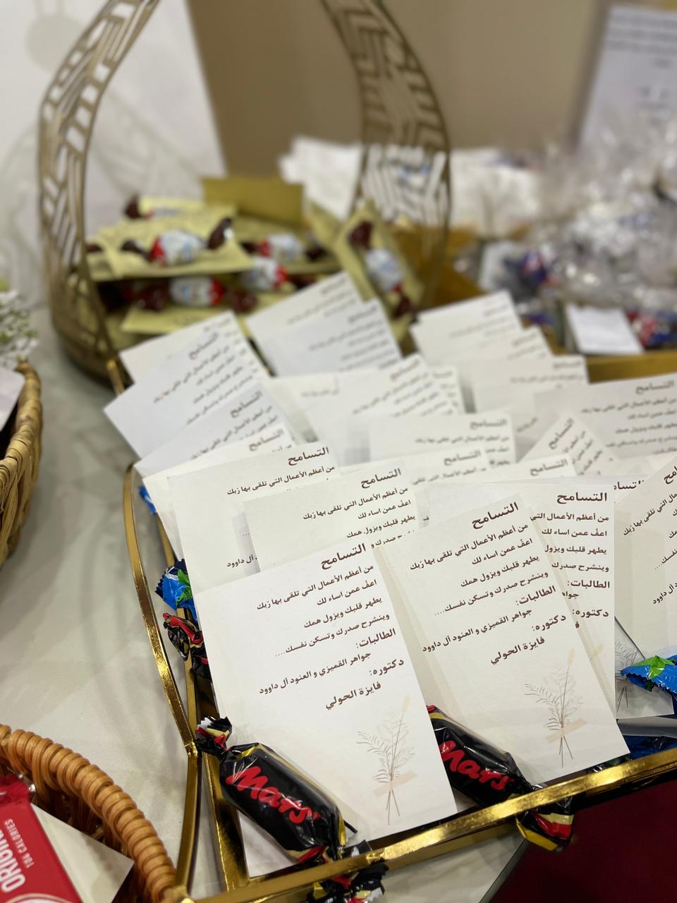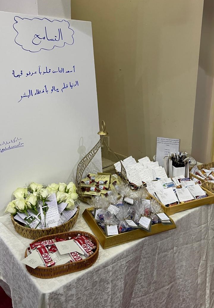 قدمت الطالبات عرض عن التسامح اشتمل على مفهوم التسامح في القرآن الكريم والسنة النبوية. وأنواع التسامح وأثره على الفرد والمجتمع. وتم تقديم مسابقة الأسئلة المرقمة عن طريق توزيع أرقام على المقاعد واختيار ارقام عشوائية لتوجيه الأسئلة، وحصلت الفائزات على جوائز تشجيعية، واشتمل البرنامج على ركن يحتوي توزيعات وبطاقات تشجع على التسامح والعفو والصفح.